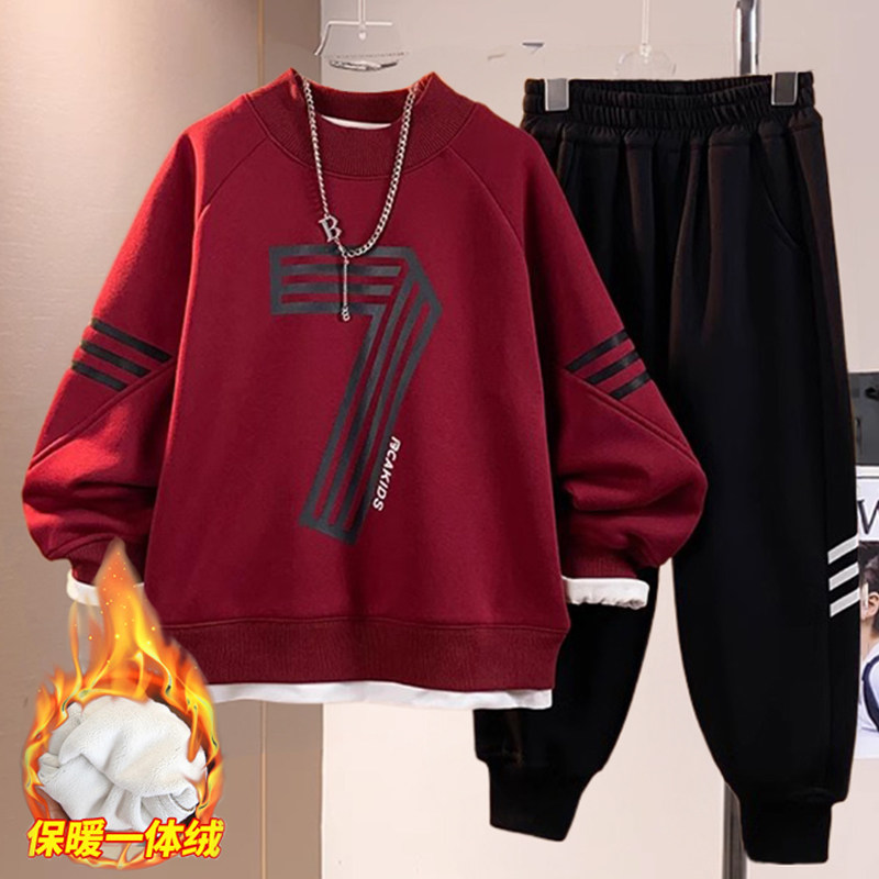 男童春秋装套装2026新款儿童中大童运动秋冬季帅气加绒红色两件套