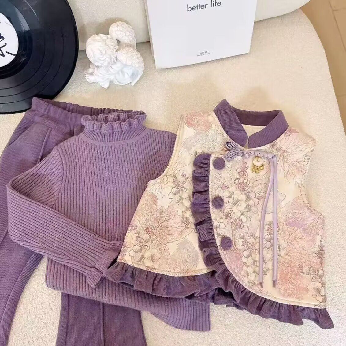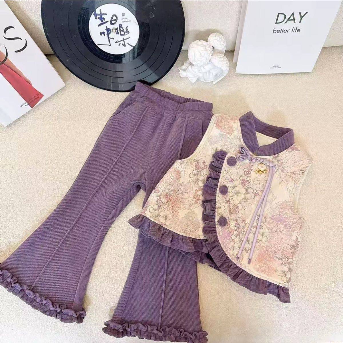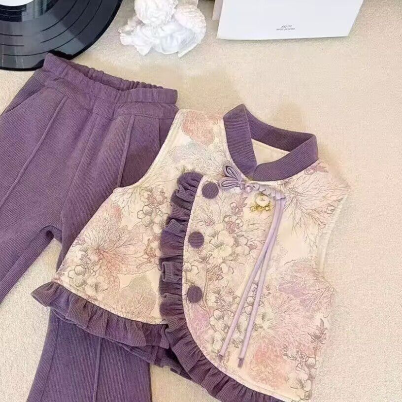 女童套装冬季2025新款儿童加厚马甲新中式毛衣加绒裤子三件套