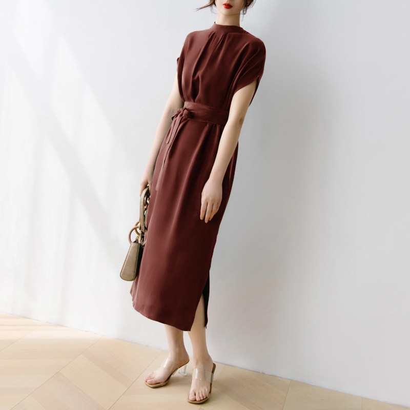 法式复古天丝立领红色连衣裙女夏高级感气质直筒简约系带显瘦长裙