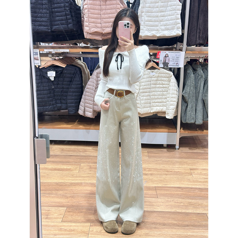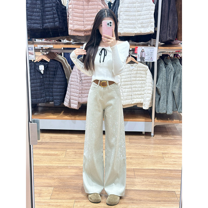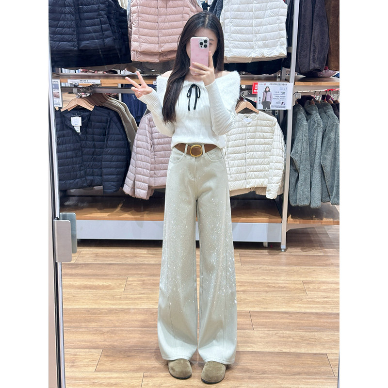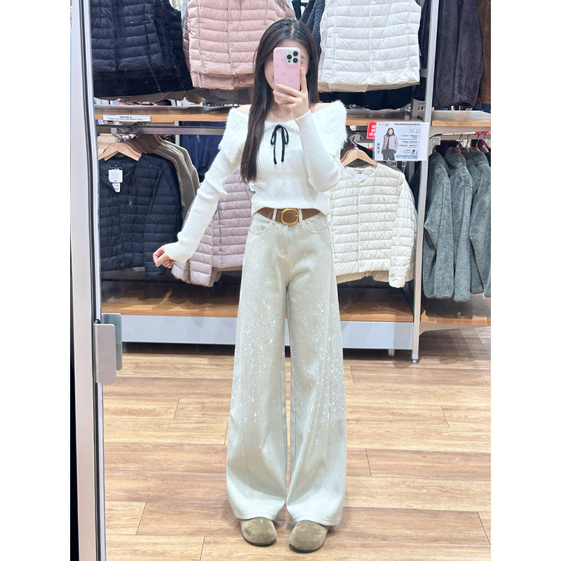 加绒阔腿满天星烫钻牛仔裤女秋冬2026新款宽松百搭设计感直筒裤子