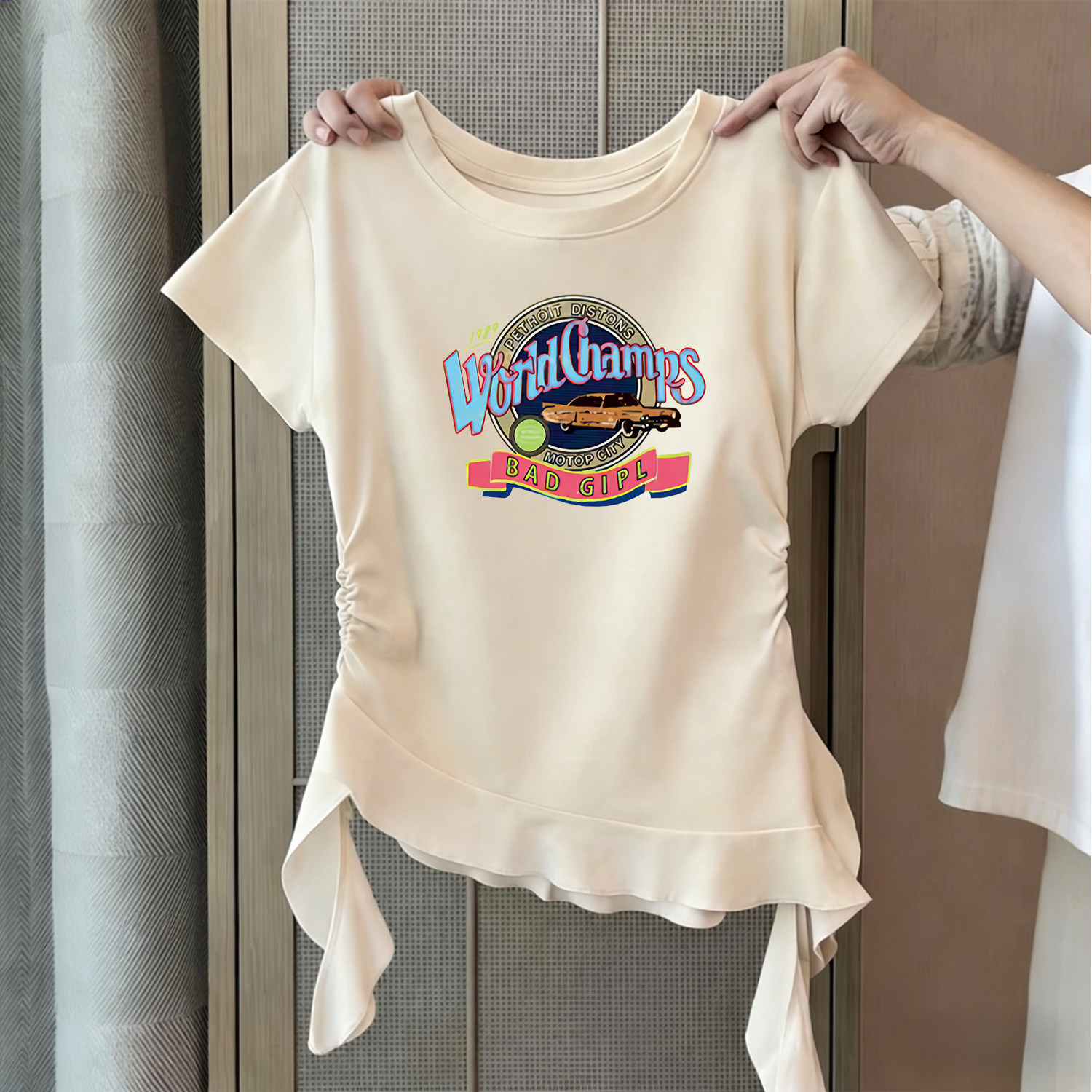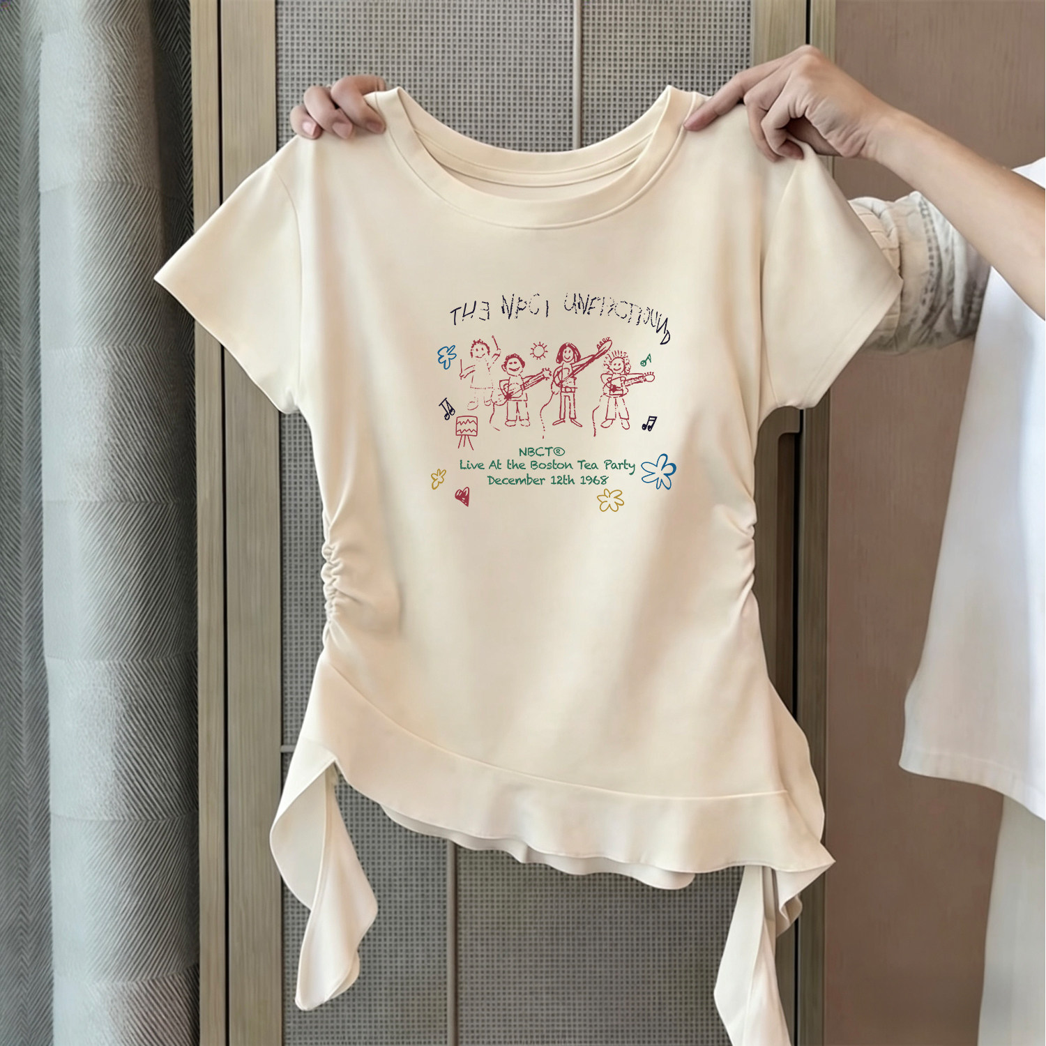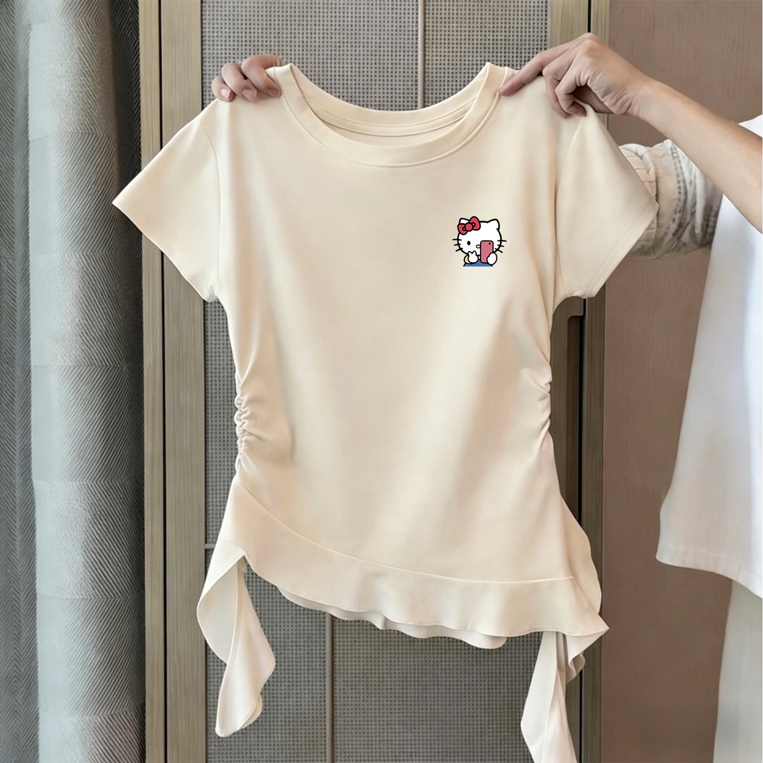 女童夏装2026新款圆领纯棉短袖T恤短款收腰儿童设计感不规则上衣