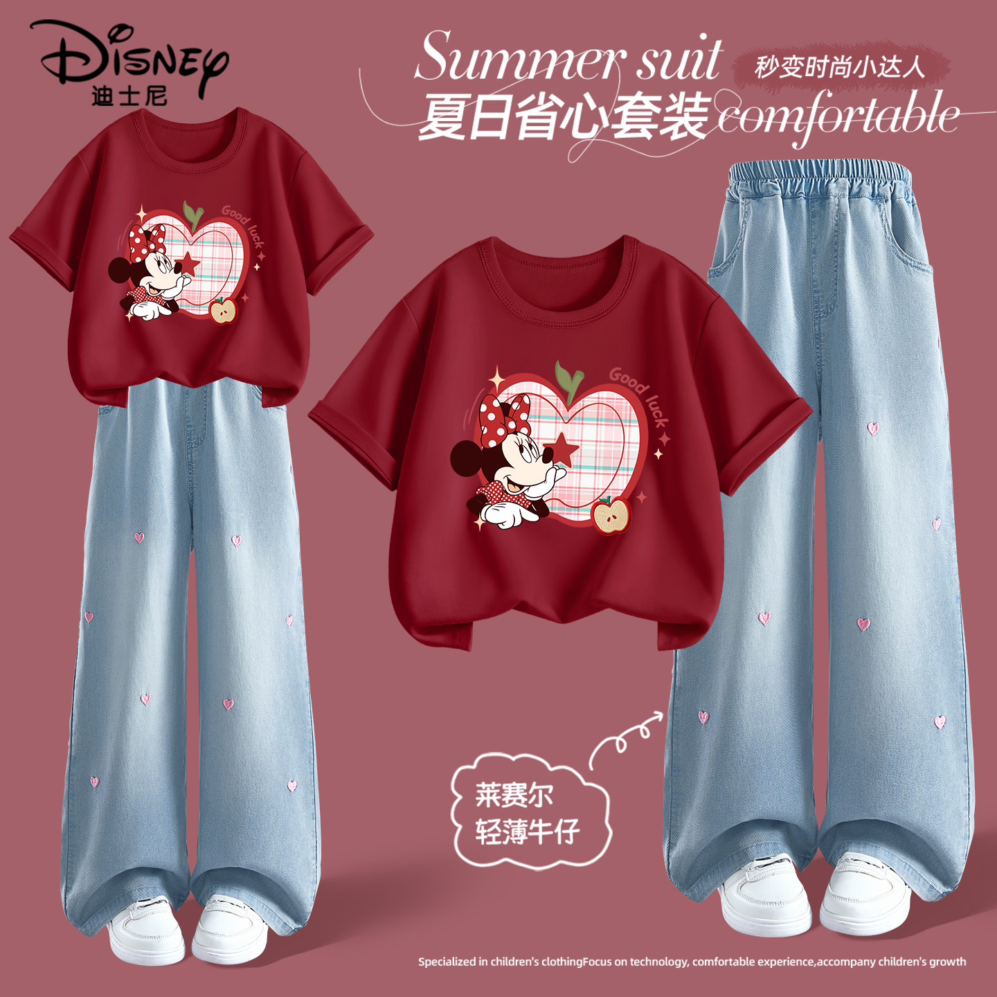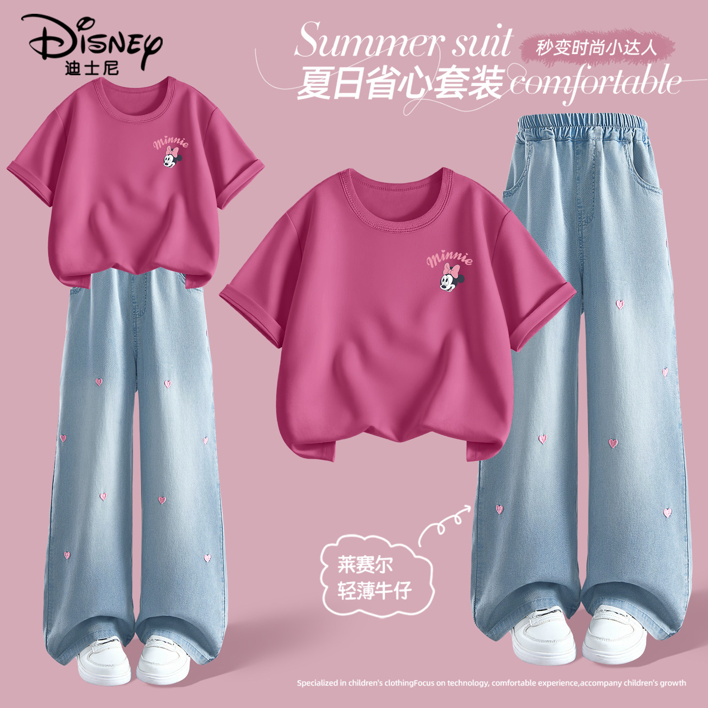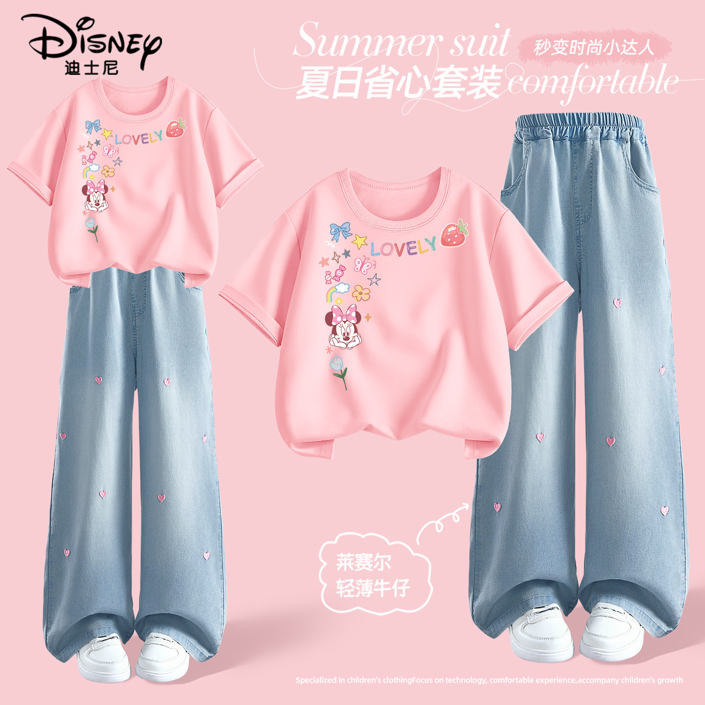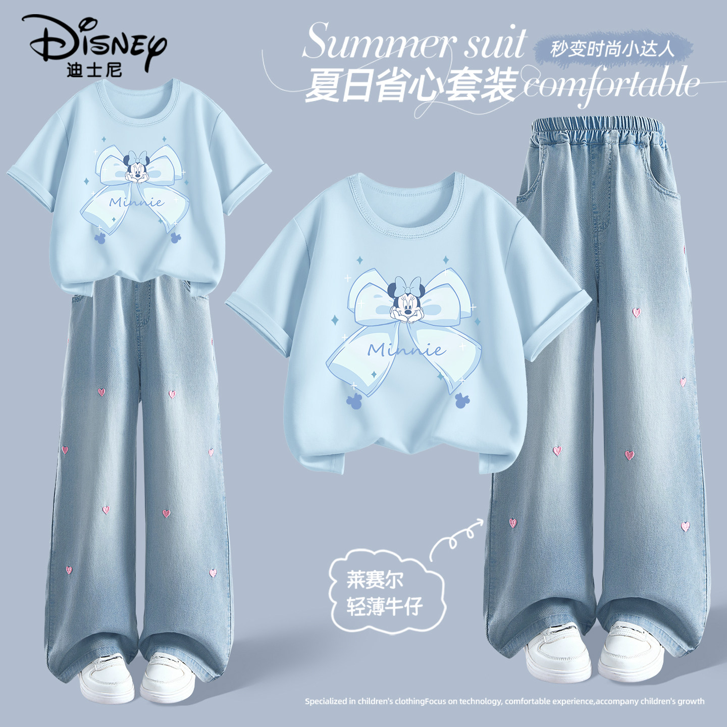 迪士尼儿童夏装套装2026新款大童夏天运动服女童夏季轻薄款牛仔裤