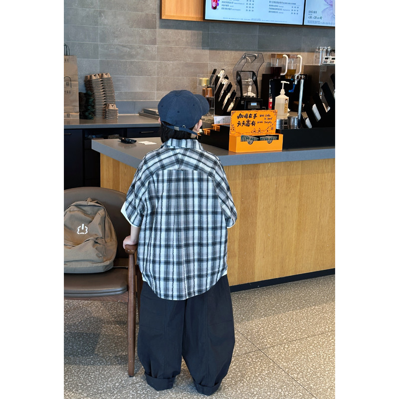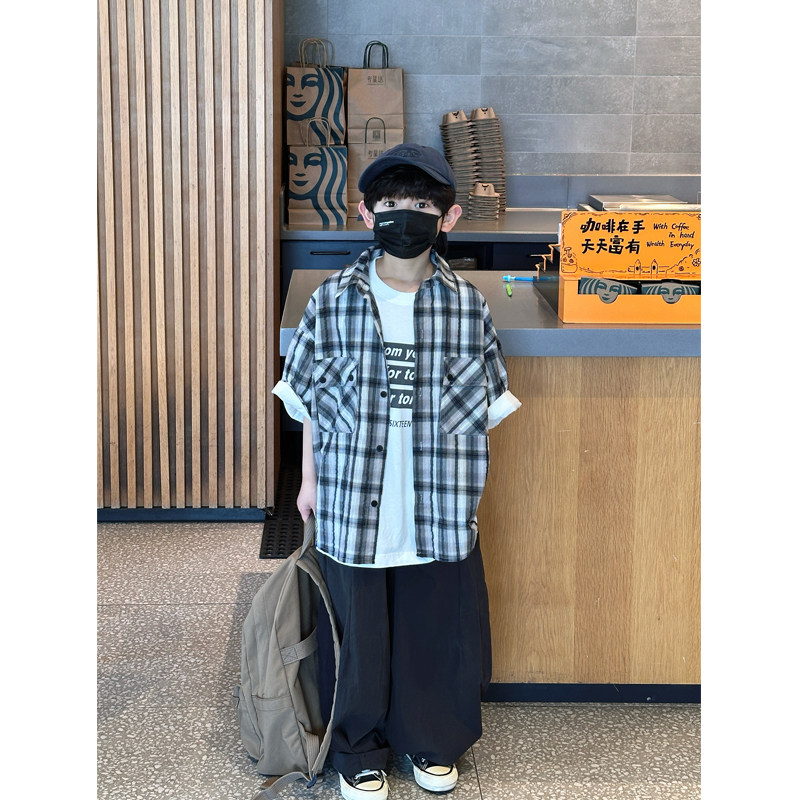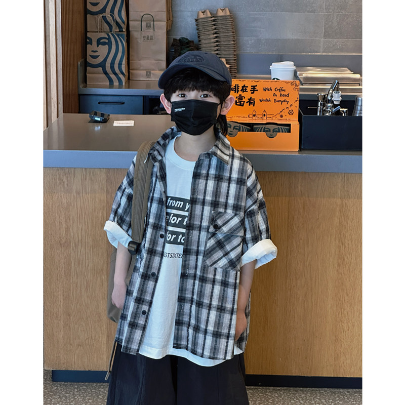 凯文家童装2026年春夏新品男童中大童韩版格子衬衫儿童短袖外套