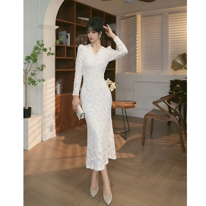 秋冬气质连衣裙女高级感打底长裙法式V领长袖内搭显瘦蕾丝鱼尾裙