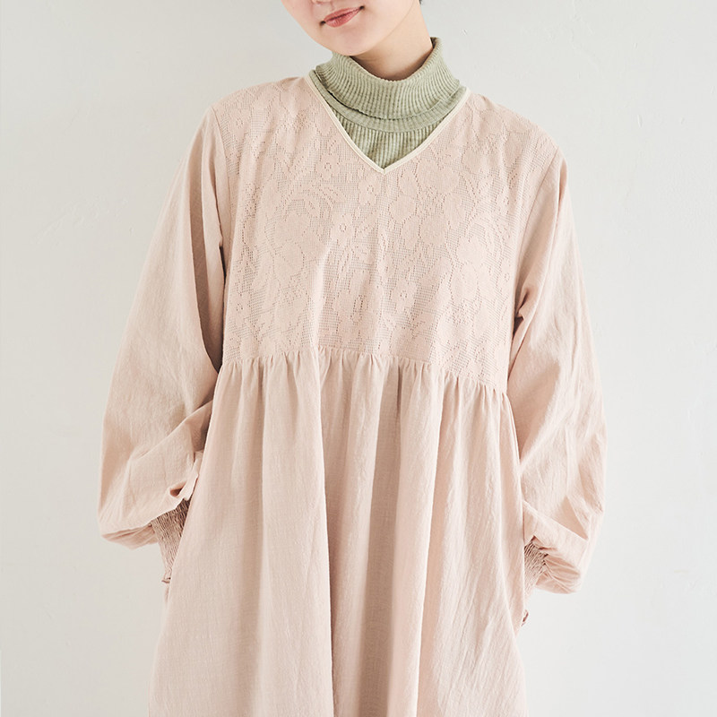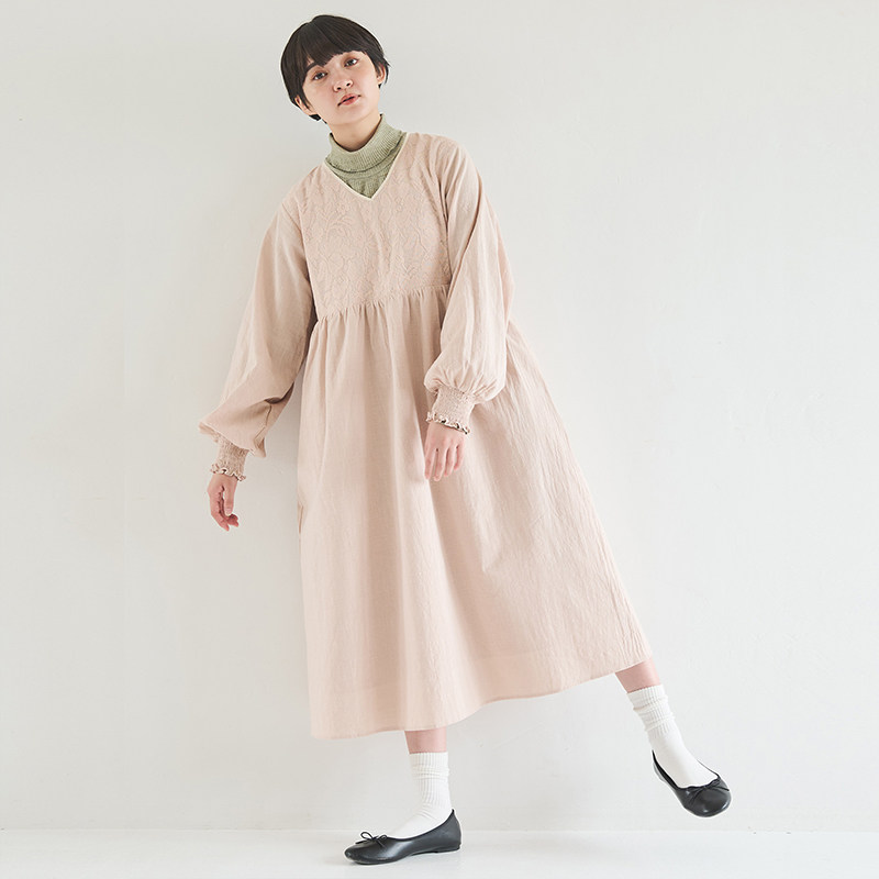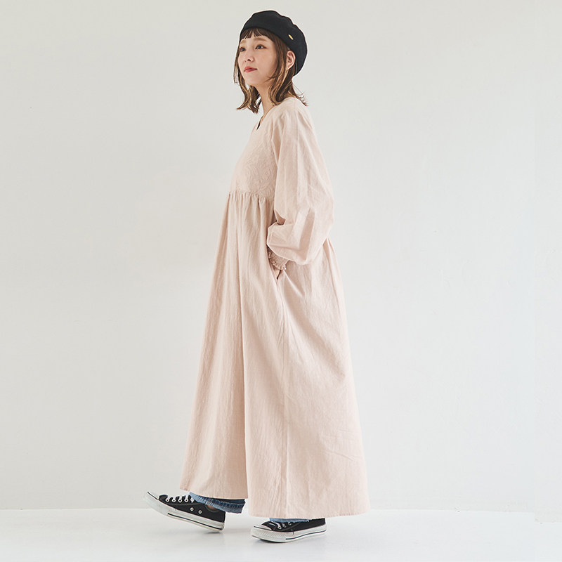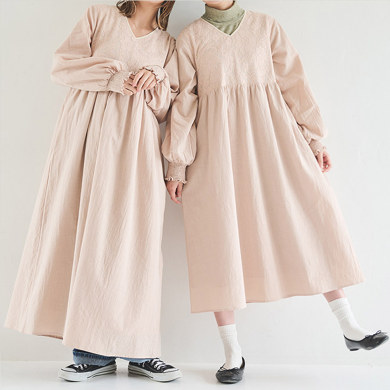 CRISP日系文艺蕾丝绣长袖连衣裙V领灯笼袖小个子长裙2024秋季新款