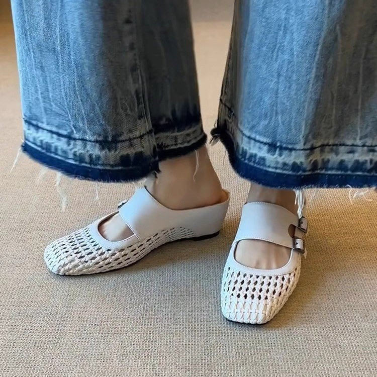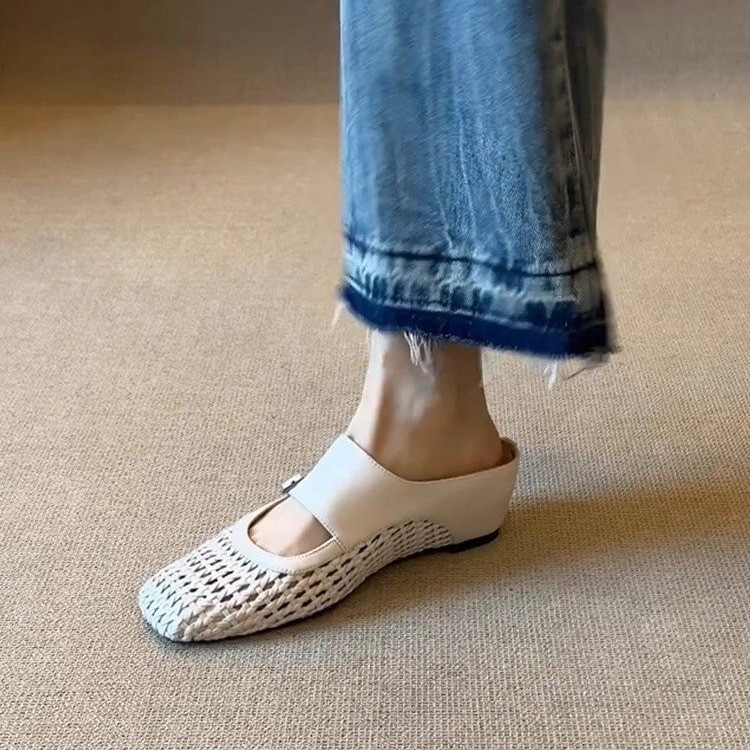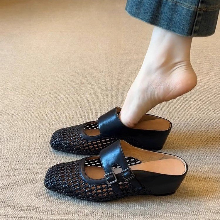 2025新款内增高一字带半拖鞋女夏季方头编织镂空透气外穿包头凉拖