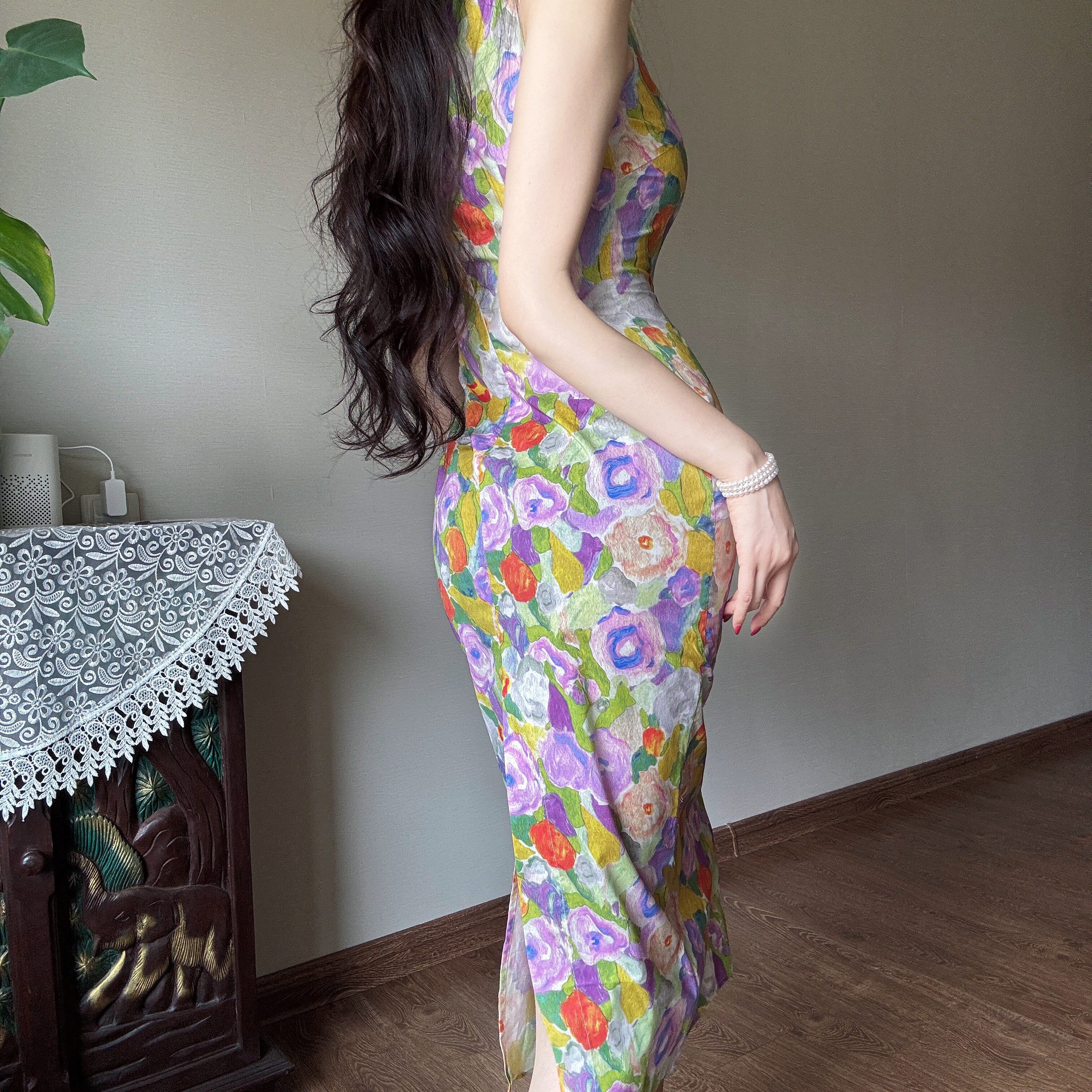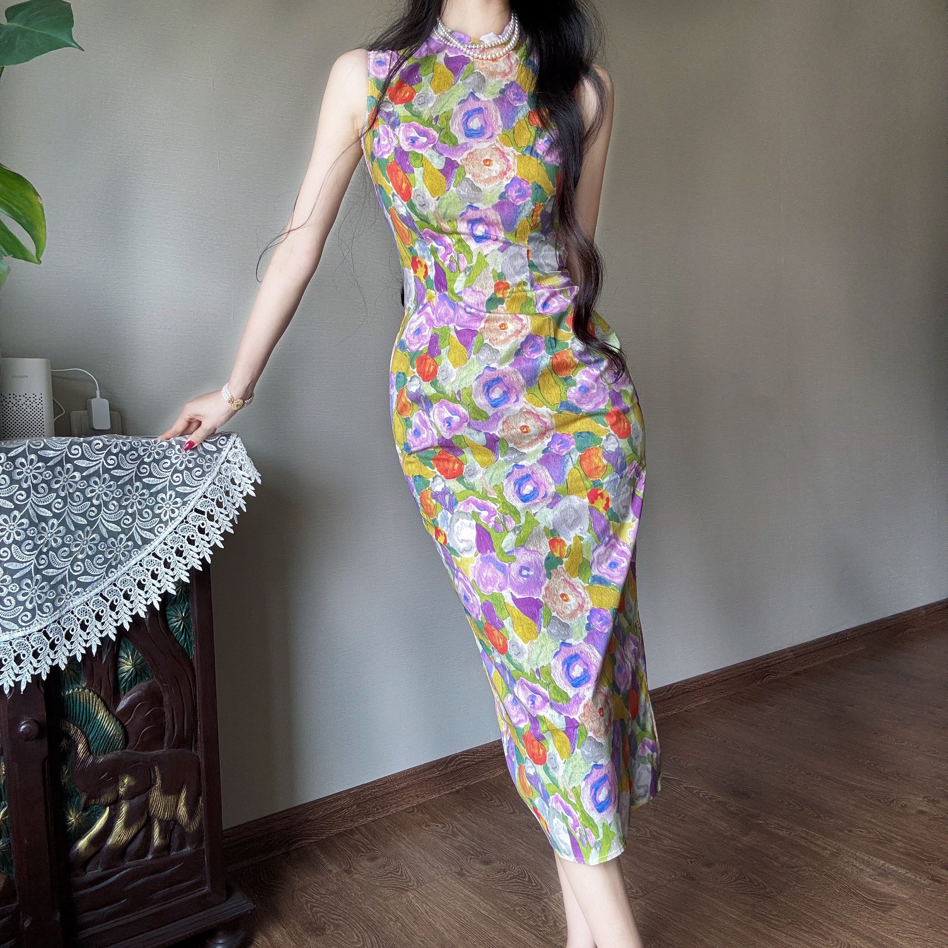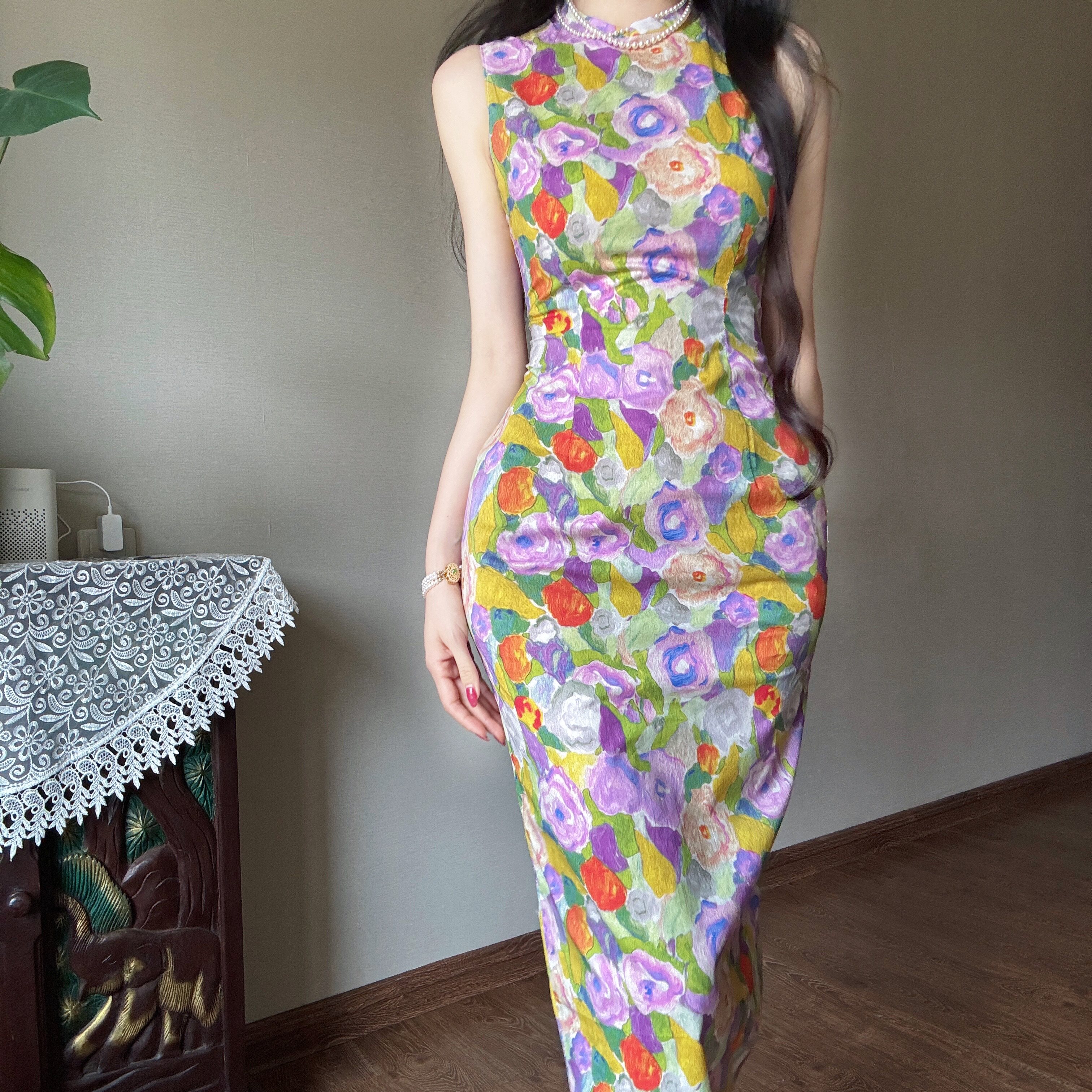 起源学新中式国风2026夏季新款多巴胺油画温柔风立领显瘦连衣裙女