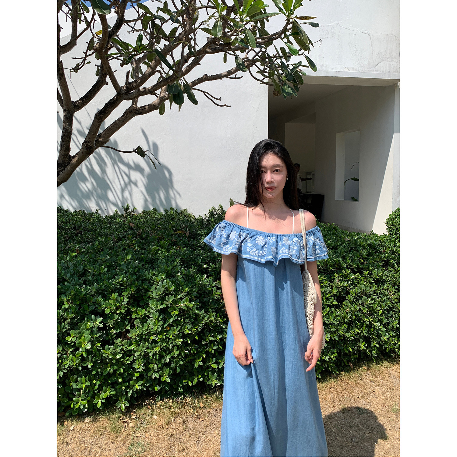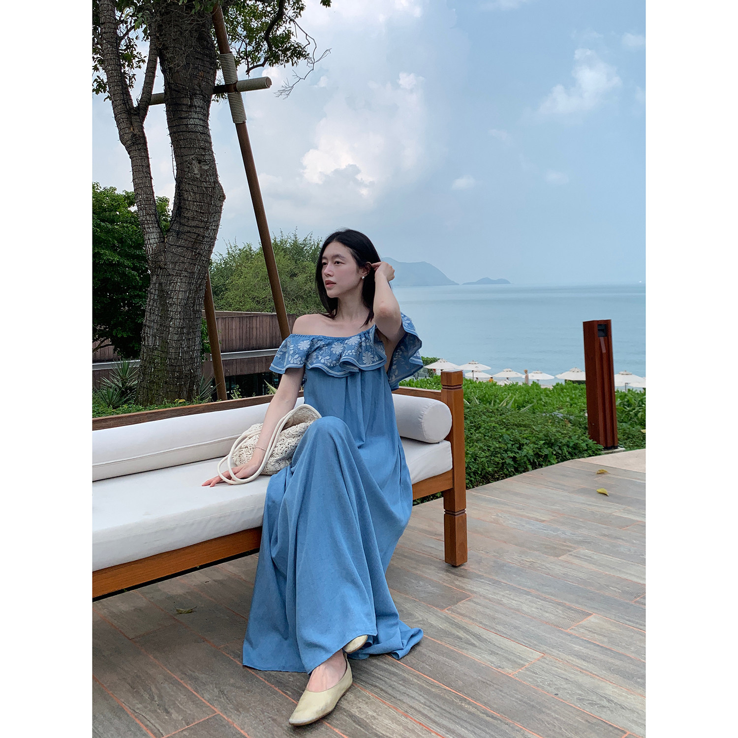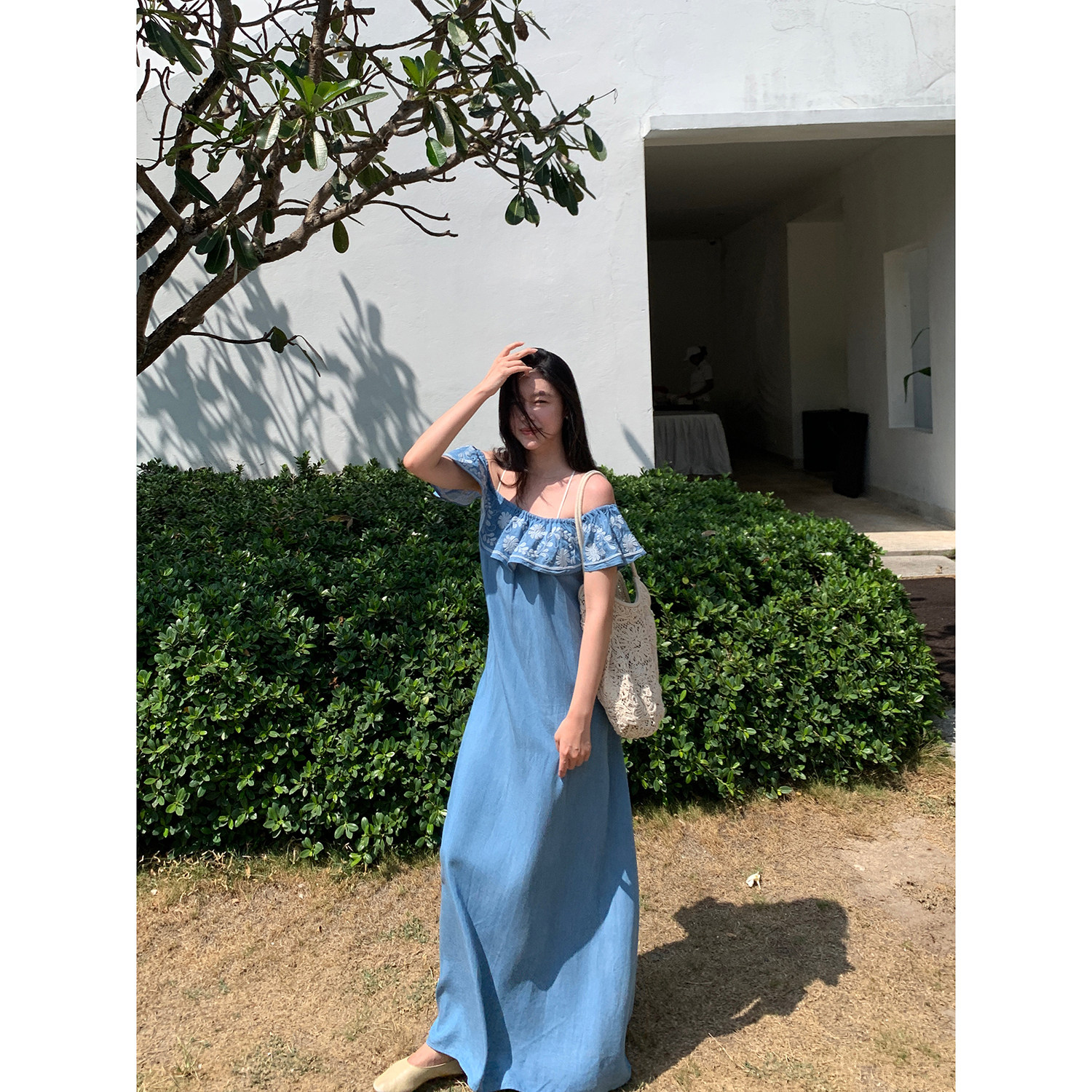 Floating 牛仔蓝刺绣花边一字领设计感天丝连衣裙女度假风长裙