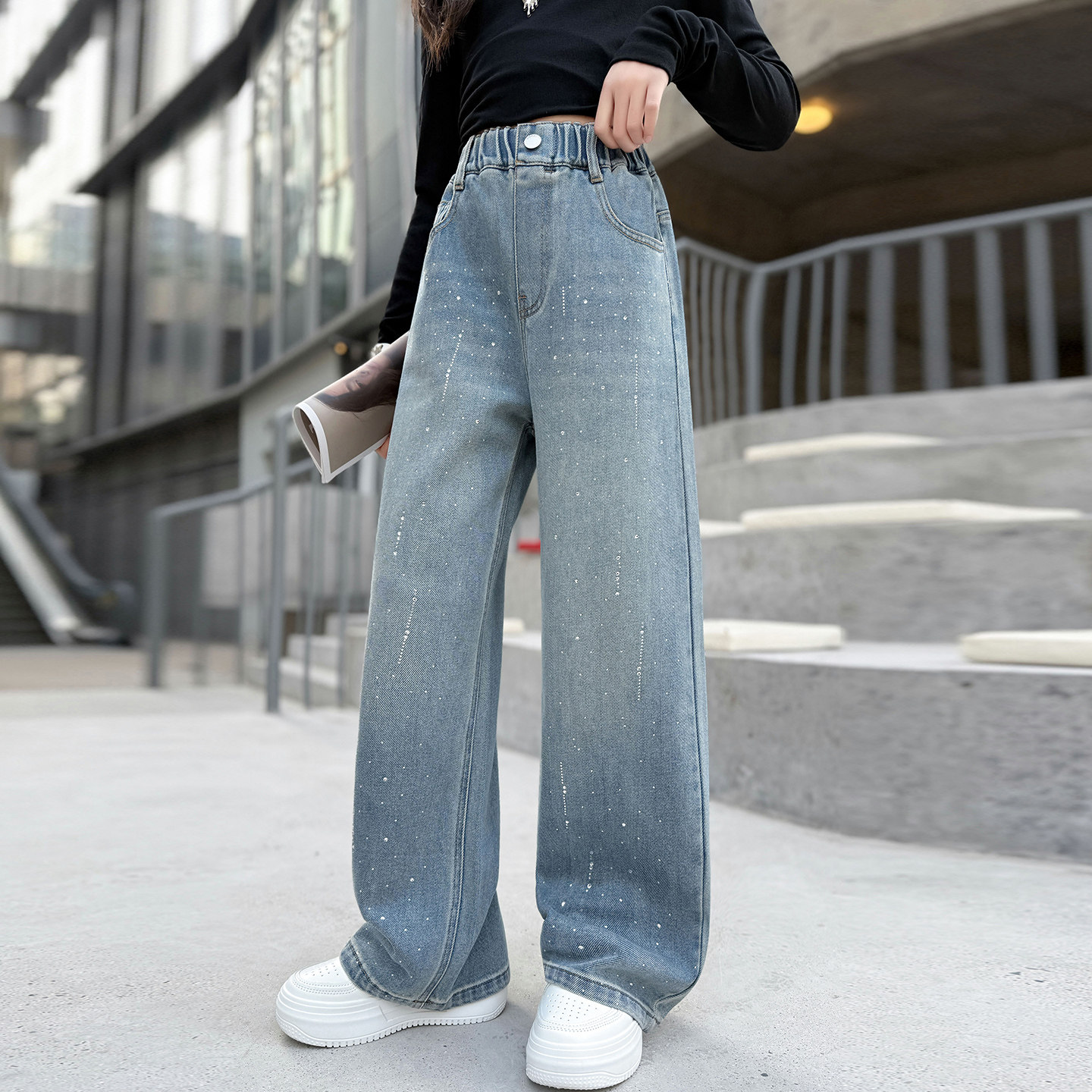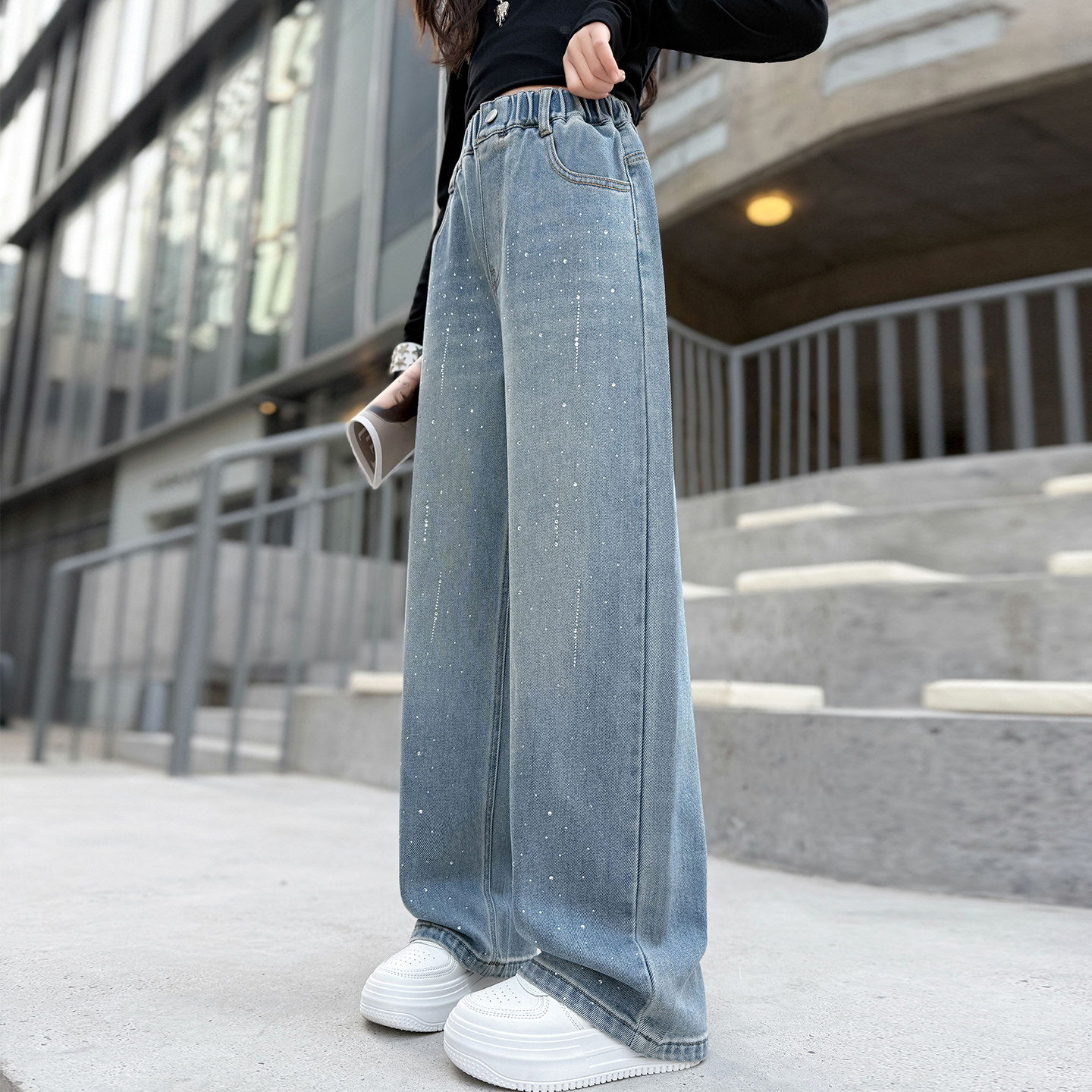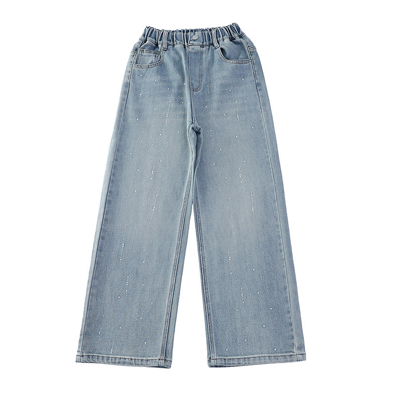 女童牛仔裤直筒春秋2026新款春装儿童裤子女孩阔腿裤带烫钻中大童