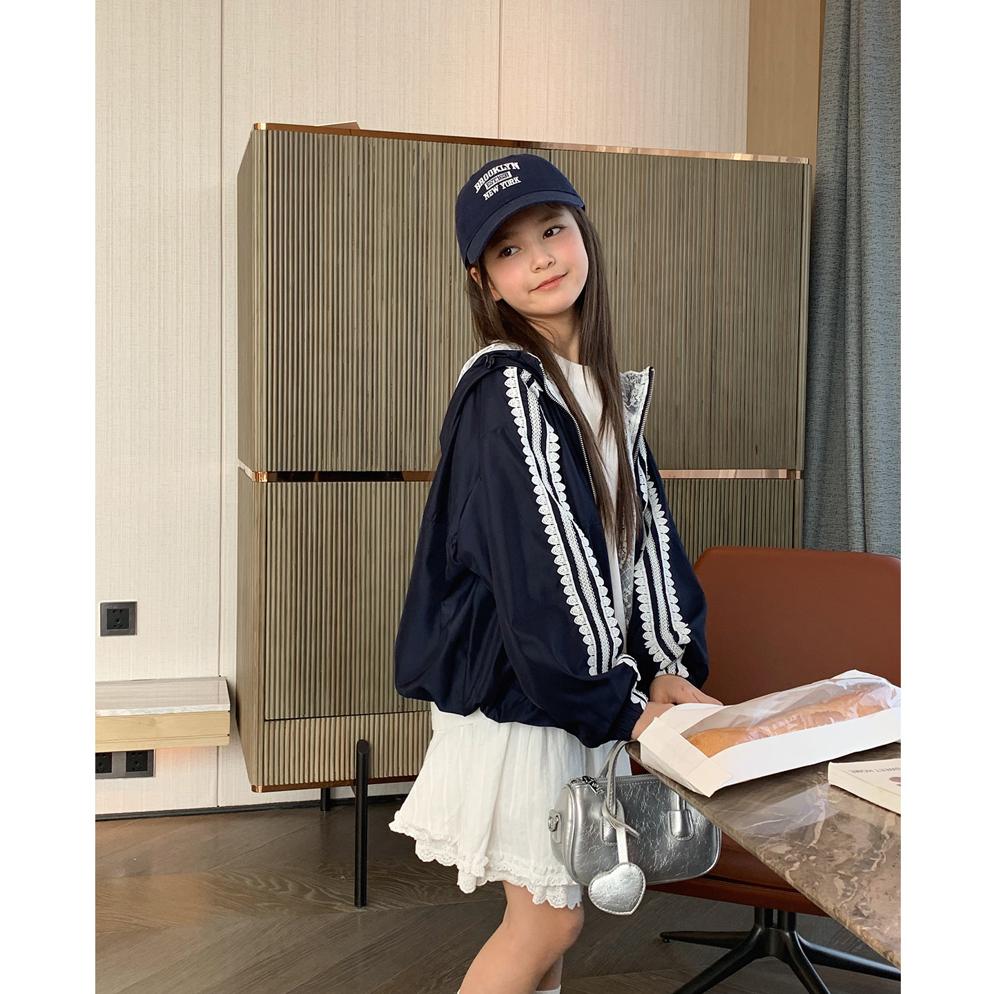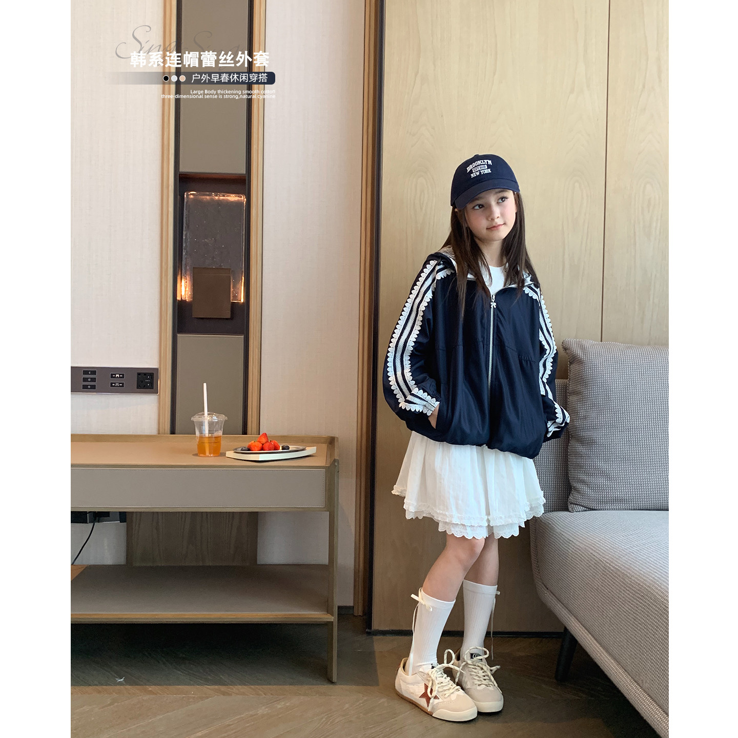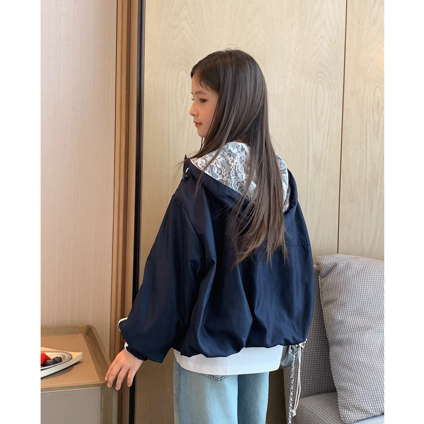 女大童藏青蕾丝连帽外套2026春装新款少女韩版短开衫学生甜美上衣