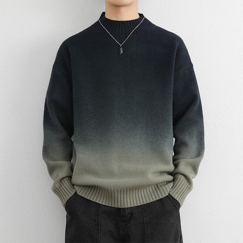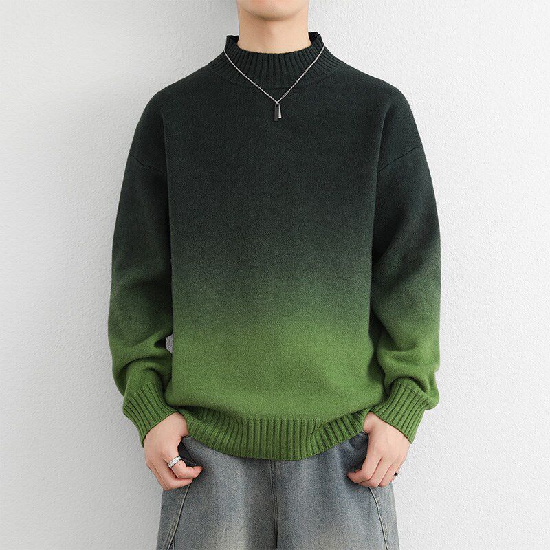 半高领毛衣男款冬季加绒加厚保暖衣时尚渐变毛线衣红色宽松打底衫