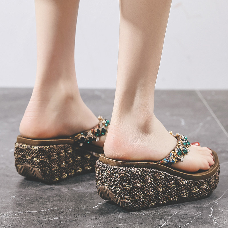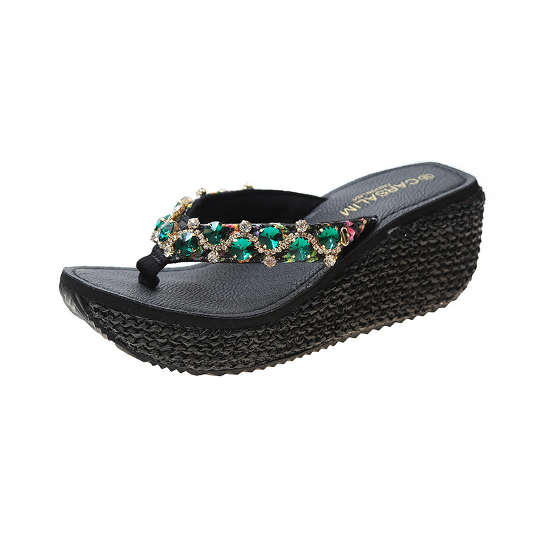名媛风重工绿宝石镶钻人字拖女厚底增高松糕跟沙滩海边度假凉拖鞋