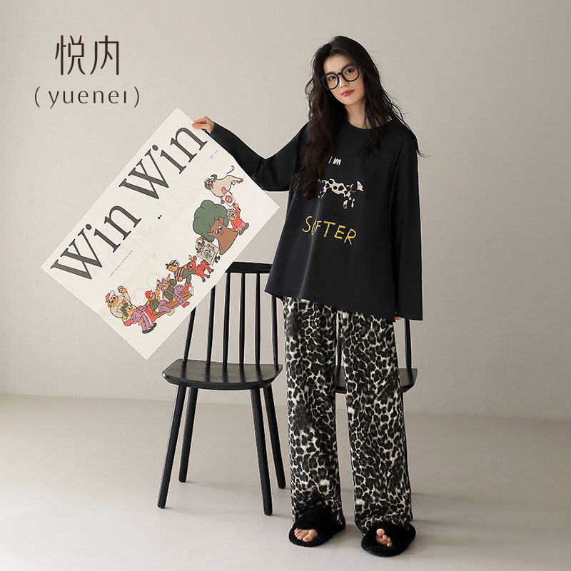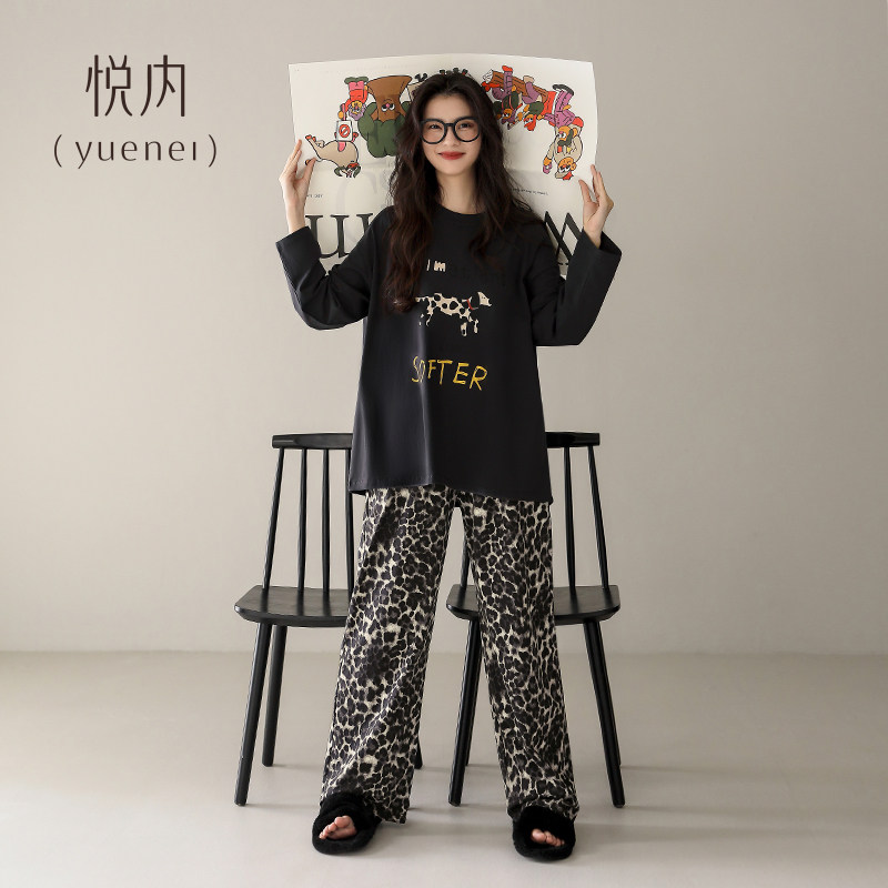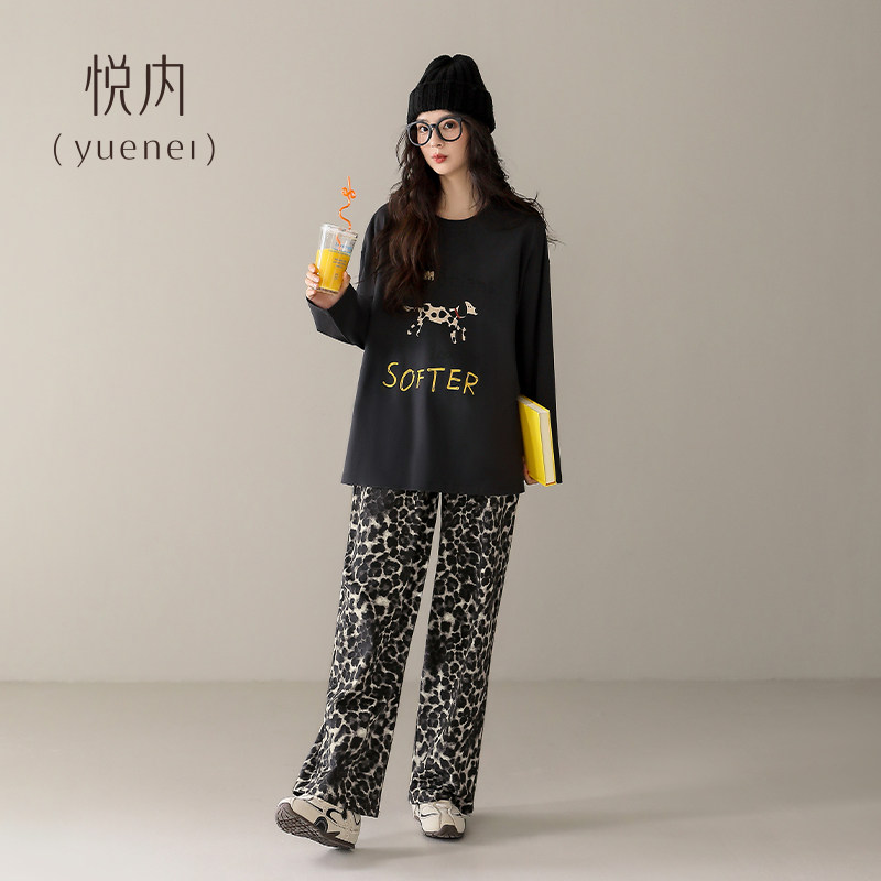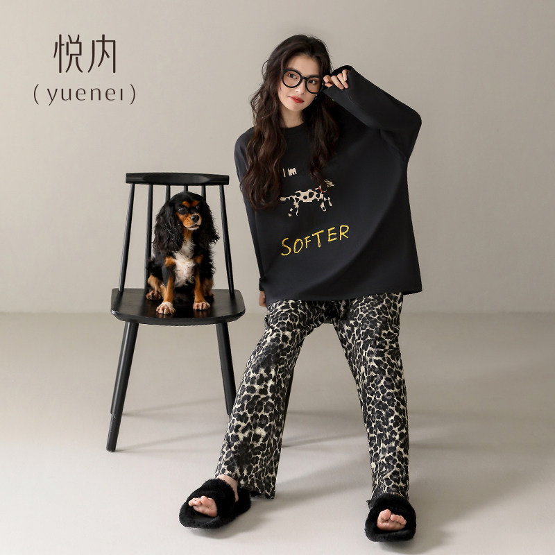 悦内睡衣女款春秋季纯棉长袖家居服宽松大码卡通斑点狗圆领可外穿