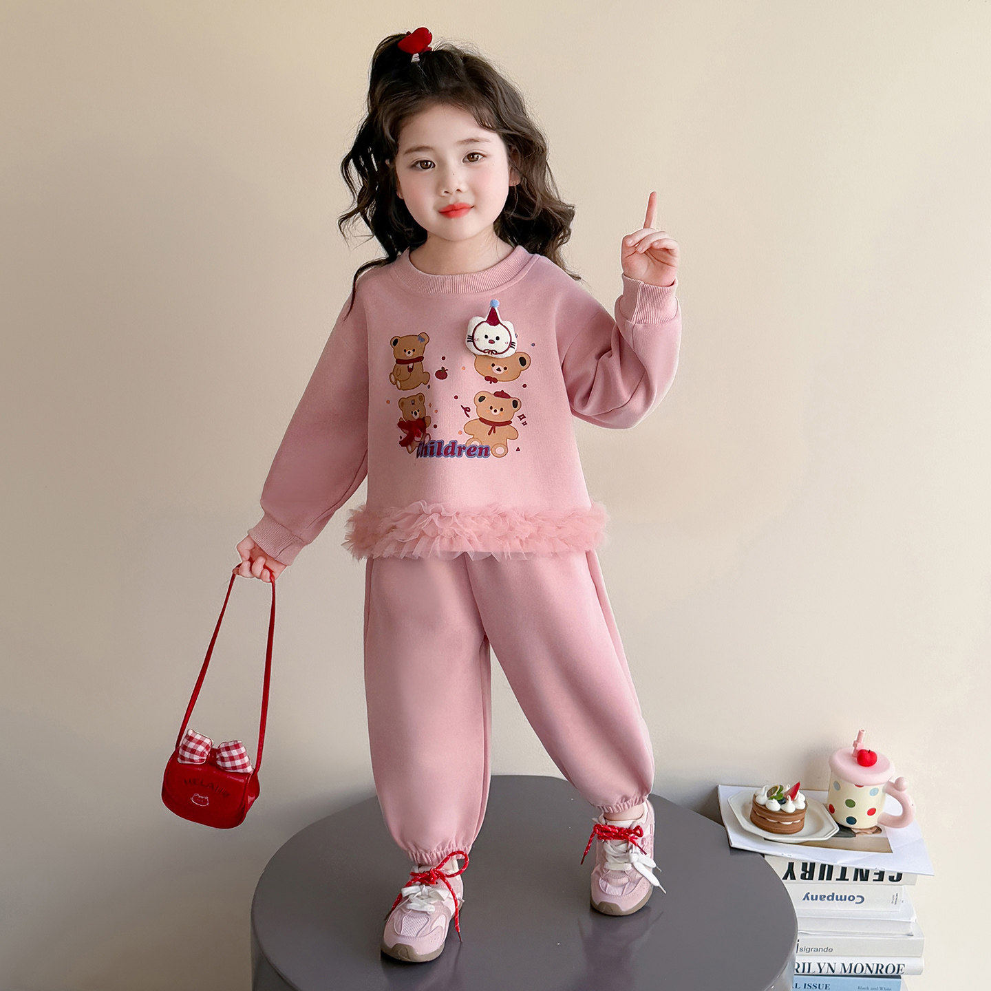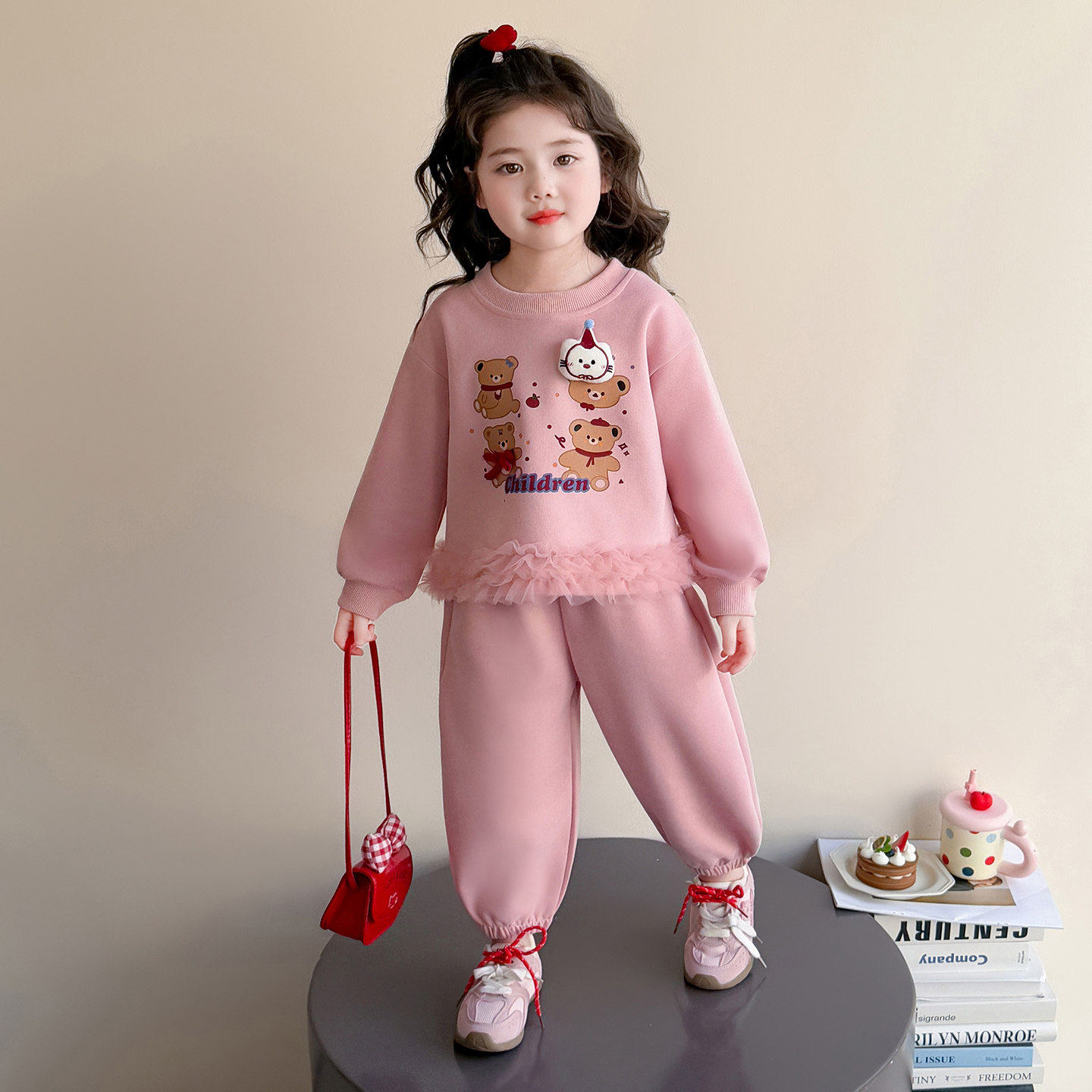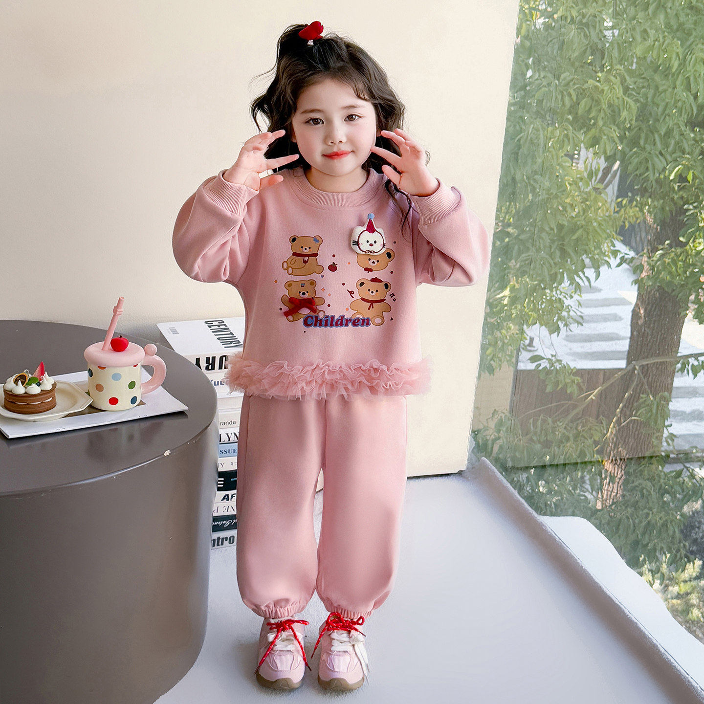 2026款休闲两件套春装儿童春秋卡通女童花边时髦女宝套装小熊卫衣