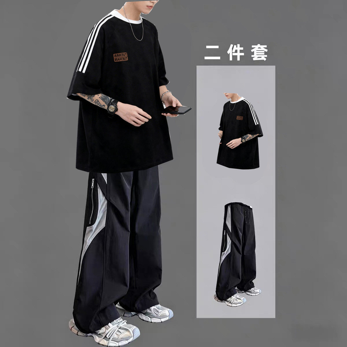 纯棉短袖t恤男生夏季百搭休闲运动服套装青少年男装帅气学生潮流