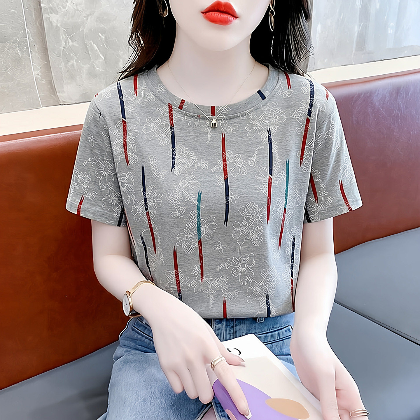 时尚纯棉短袖女t恤夏季正肩女士上衣2026新款设计感印花体恤衫夏