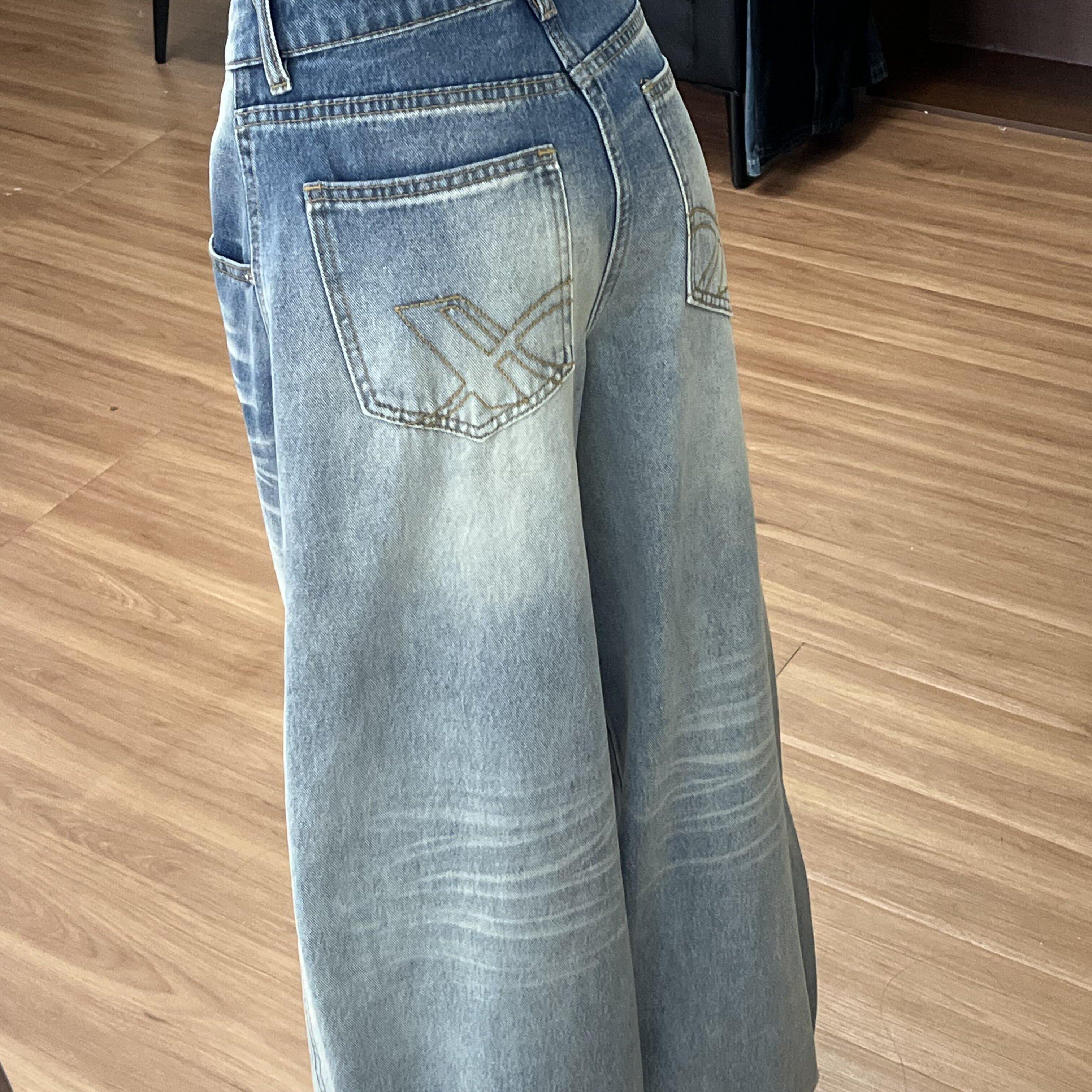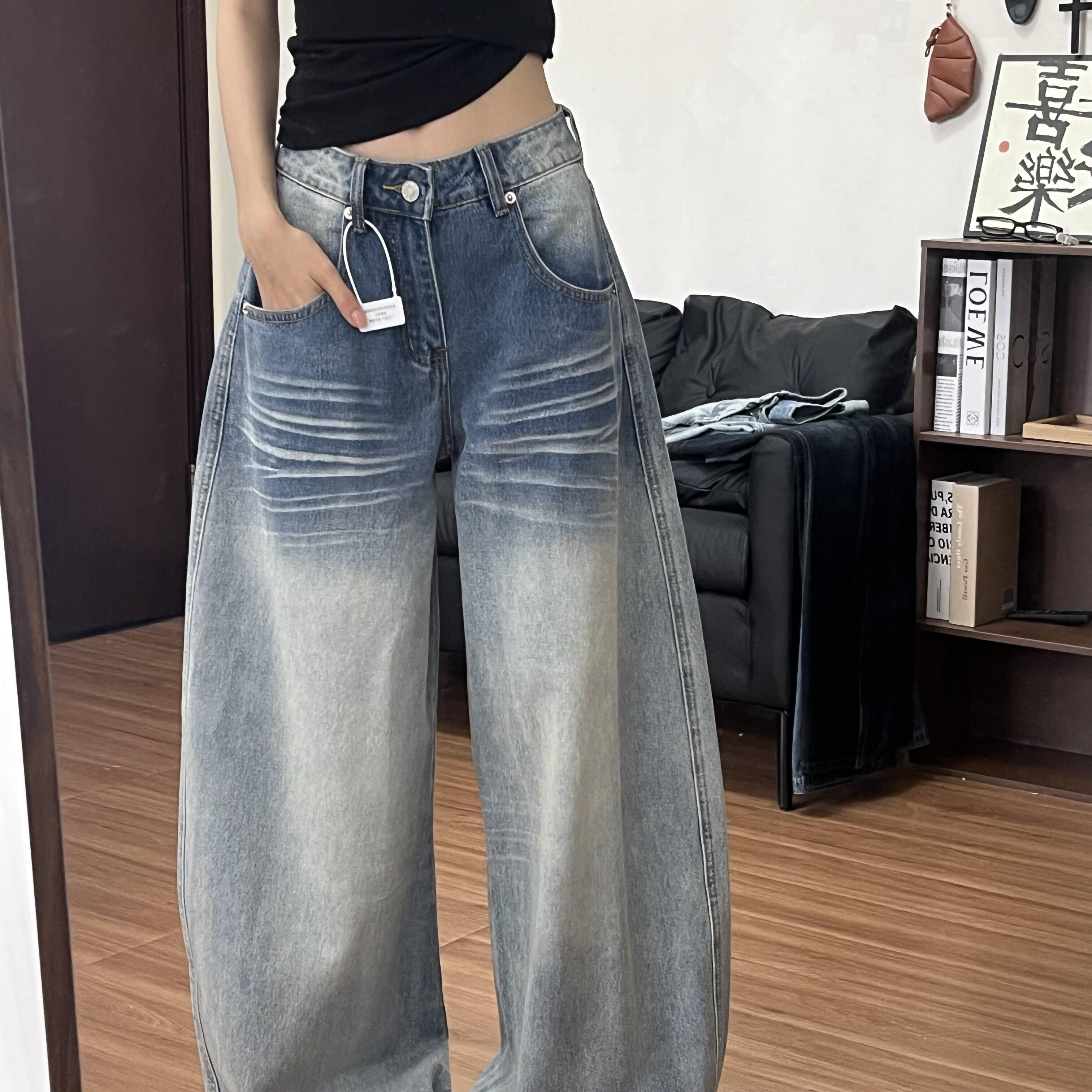 浅蓝色水洗阔腿牛仔裤女2026夏季新款猫须设计宽松显瘦拖地弯刀裤