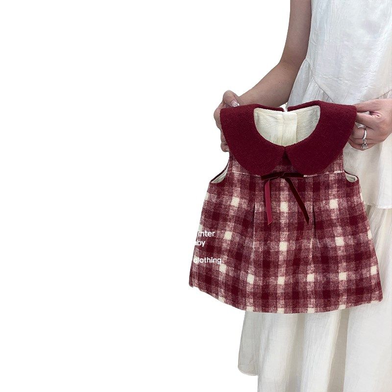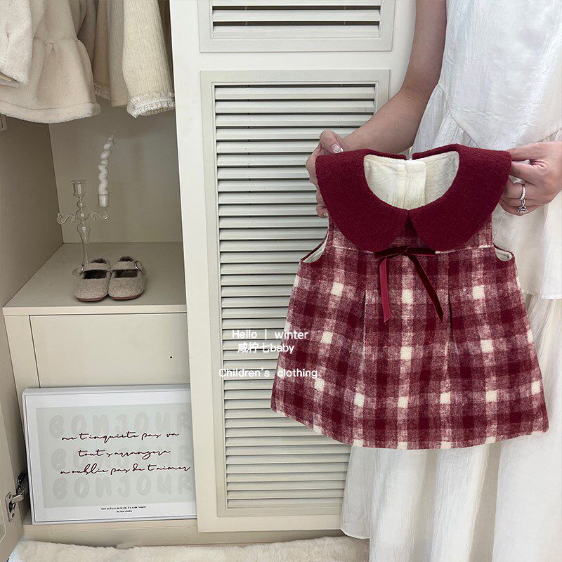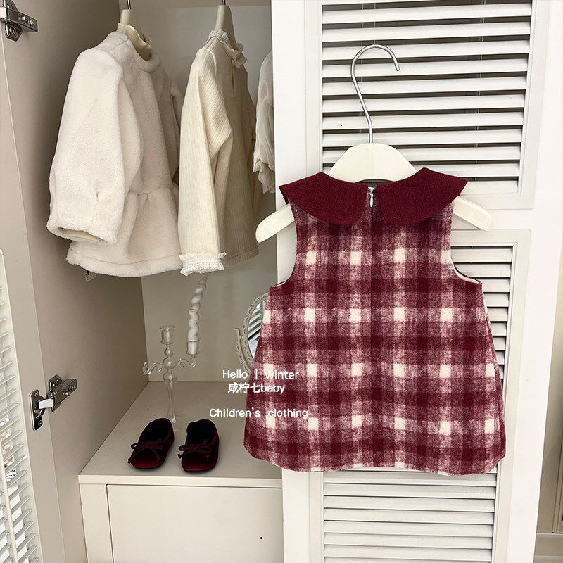 女童红色格子毛呢背心裙2024秋冬新款女孩万圣节加绒连衣裙生日裙