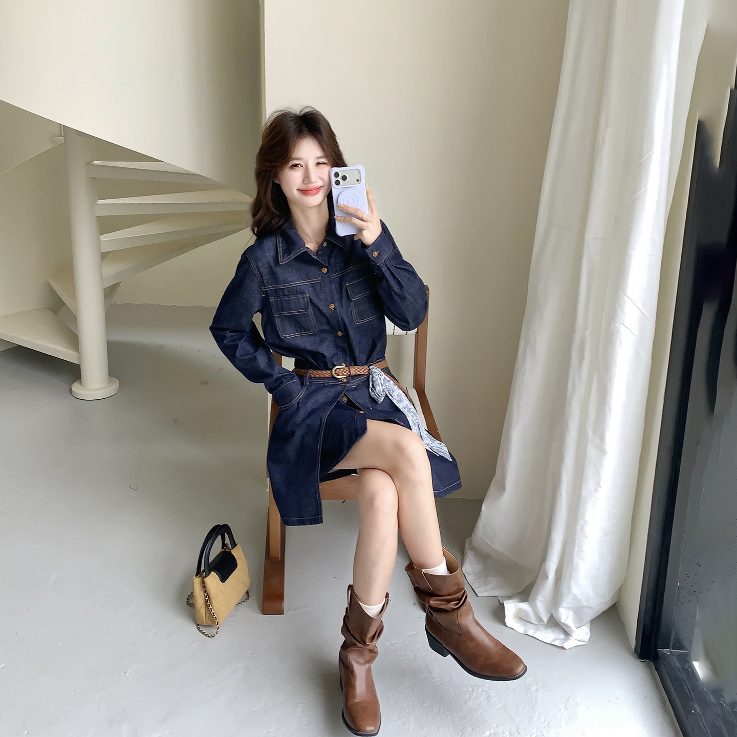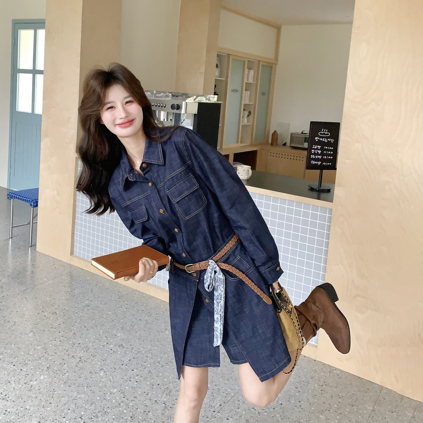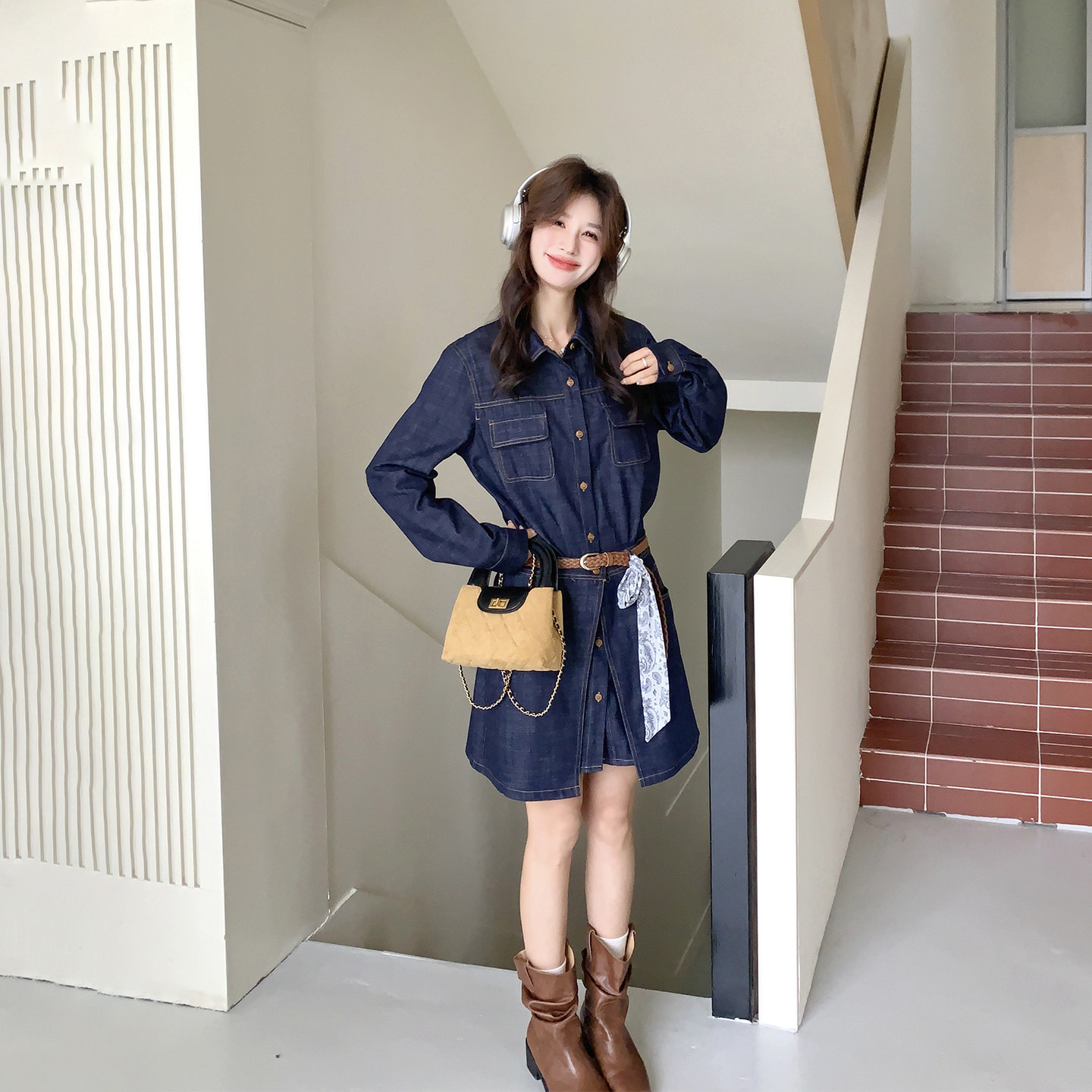 学院风气质深蓝色牛仔连衣裙套装女春季2026新款小个子短裙两件套