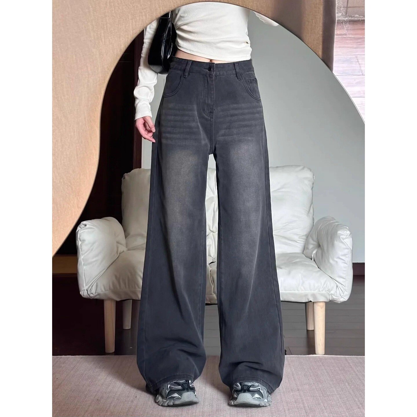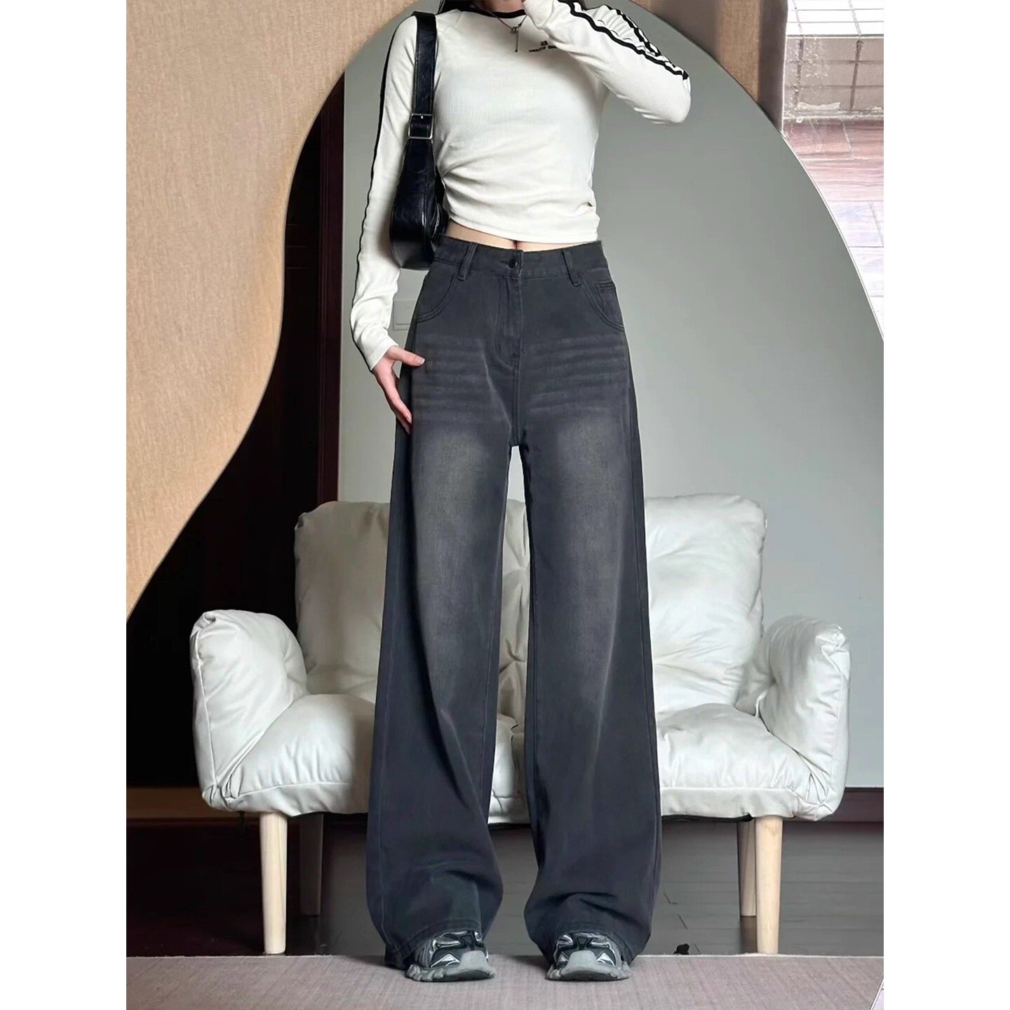 黑灰色阔腿牛仔裤女款大码胖mm高腰显瘦加绒加厚直筒裤冬遮胯裤子