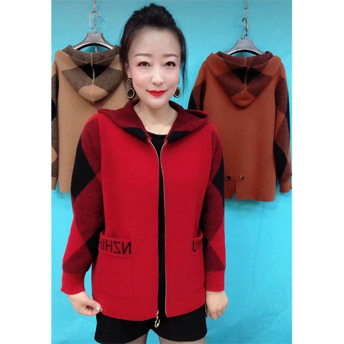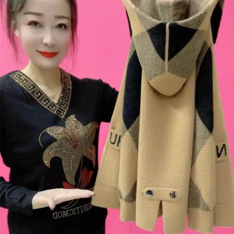 年轻妈妈秋冬双面呢外套气质中年女洋气时尚高贵连帽休闲针织开衫