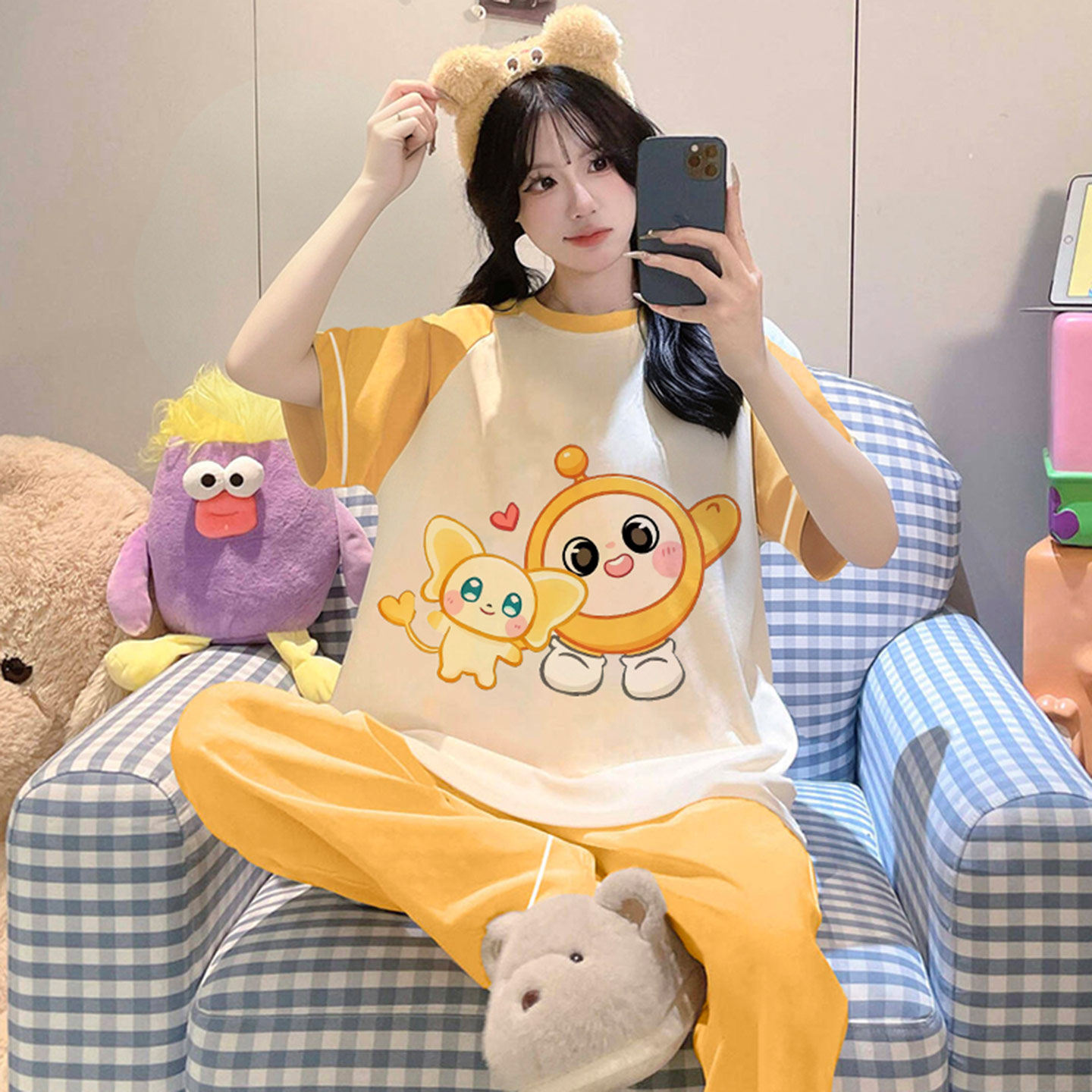 311线报网描述:纯棉女款夏季短袖长裤学生卡通家居服套装