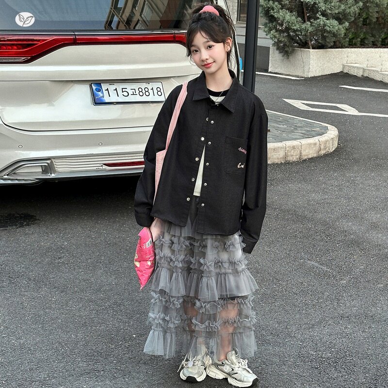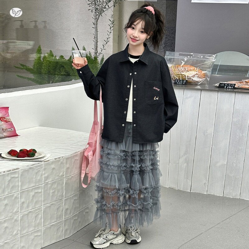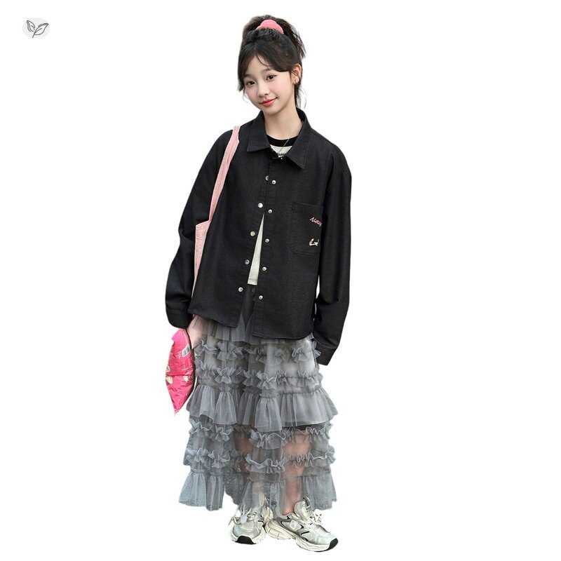 女童套装春秋2026年新款网纱蛋糕裙刺绣衬衫两件套中大童休闲春装