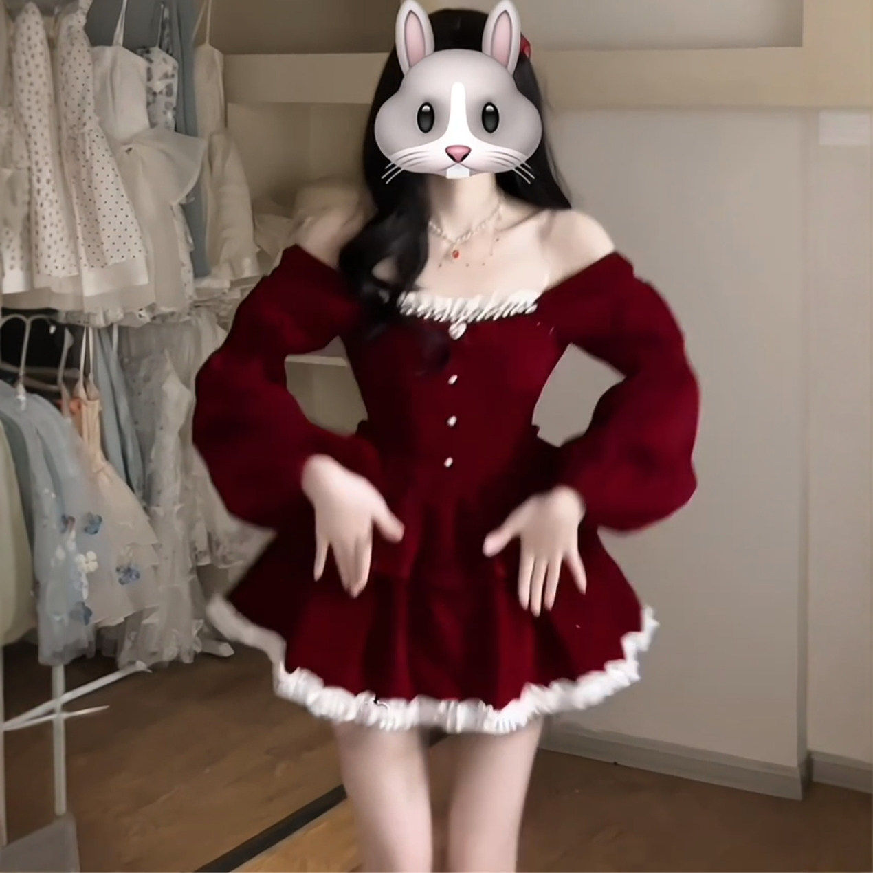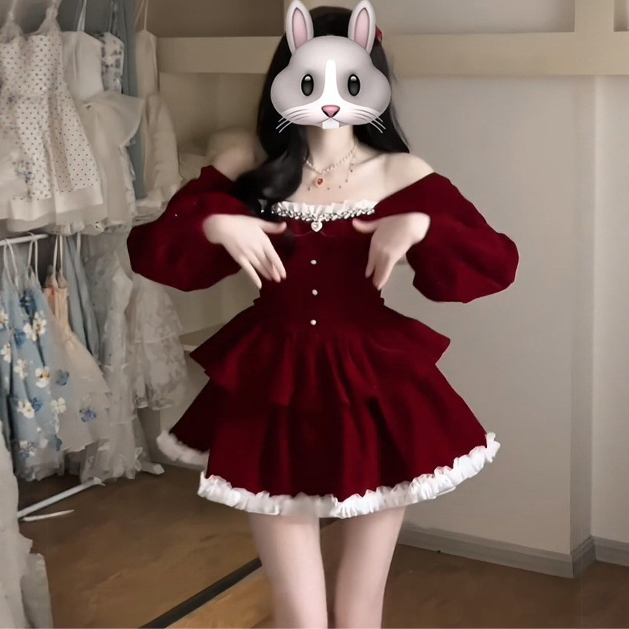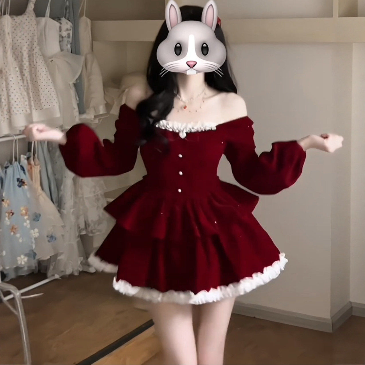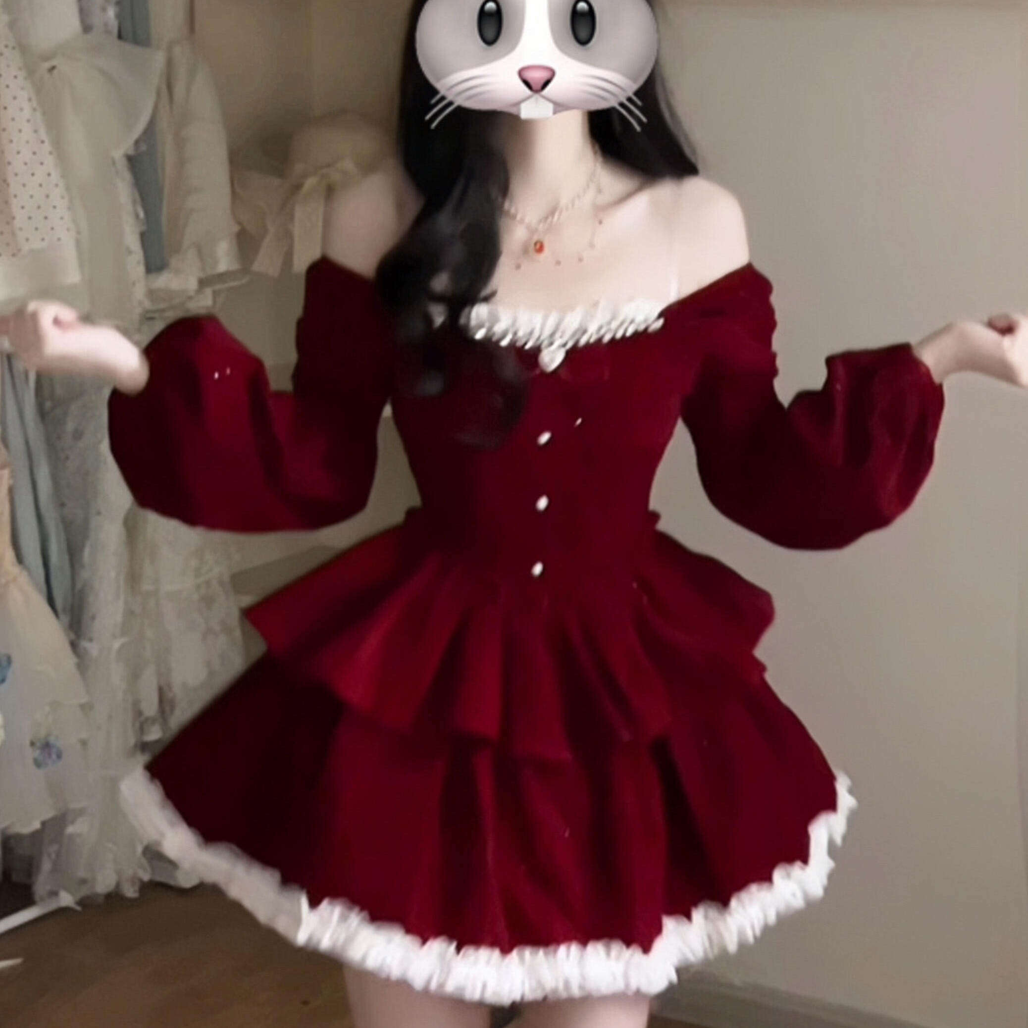 大码胖mm韩系时尚蝴蝶结红色连衣裙女春季休闲套头长袖方领蓬蓬裙