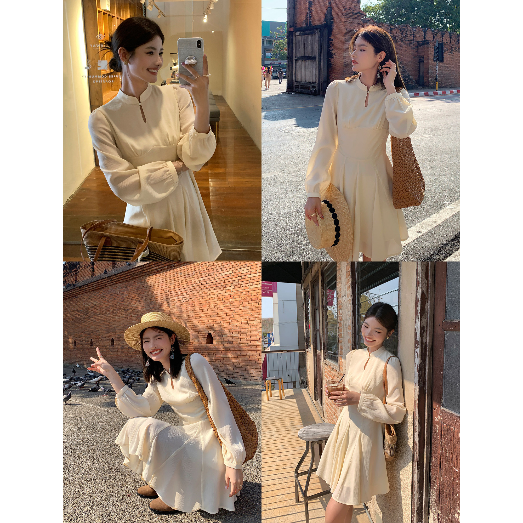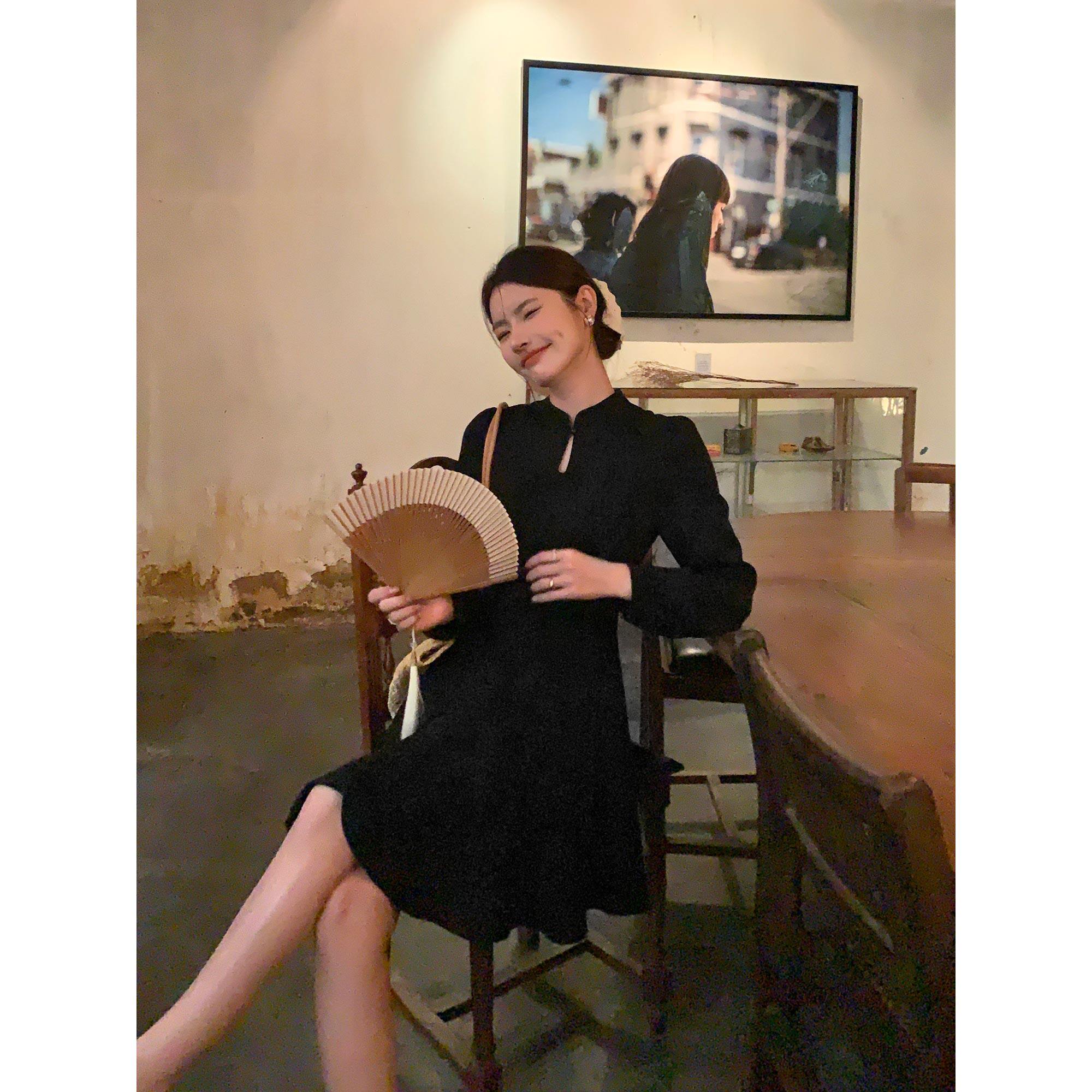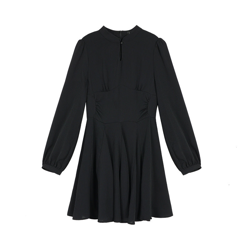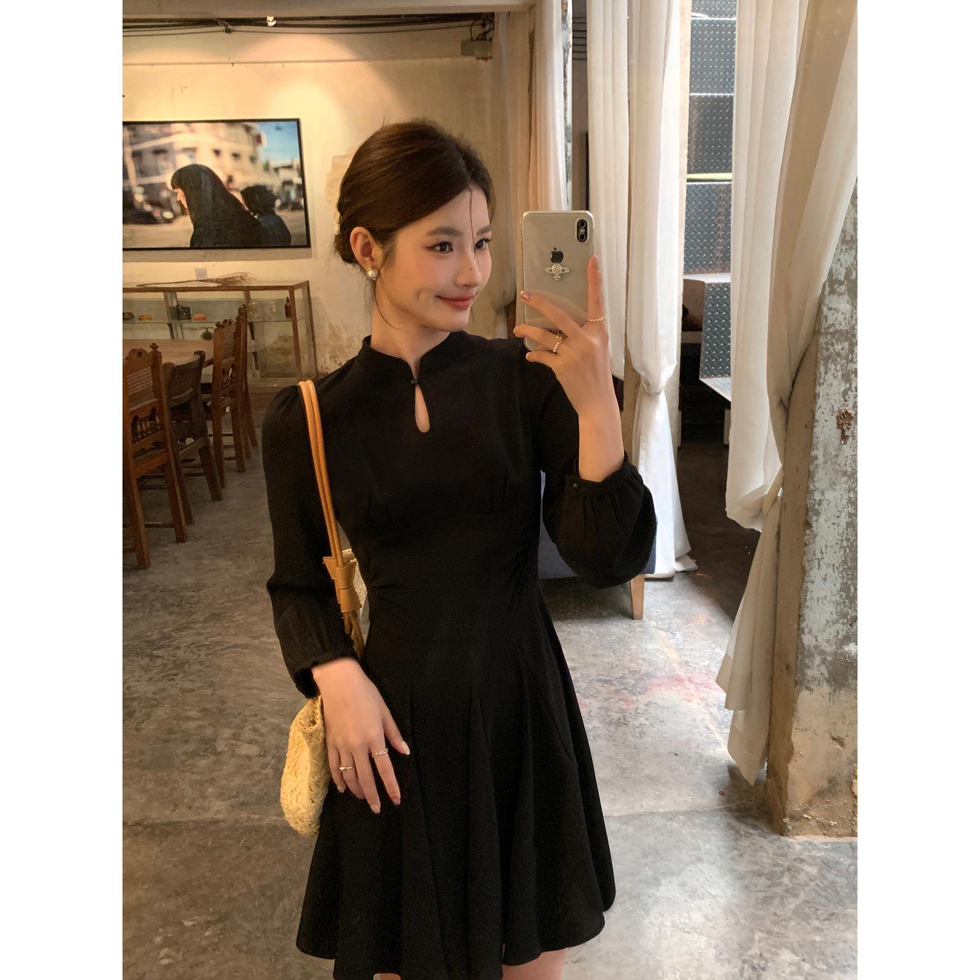 pusumede【现货5折】复古立领新中式连衣裙女长袖收腰气质a字短裙