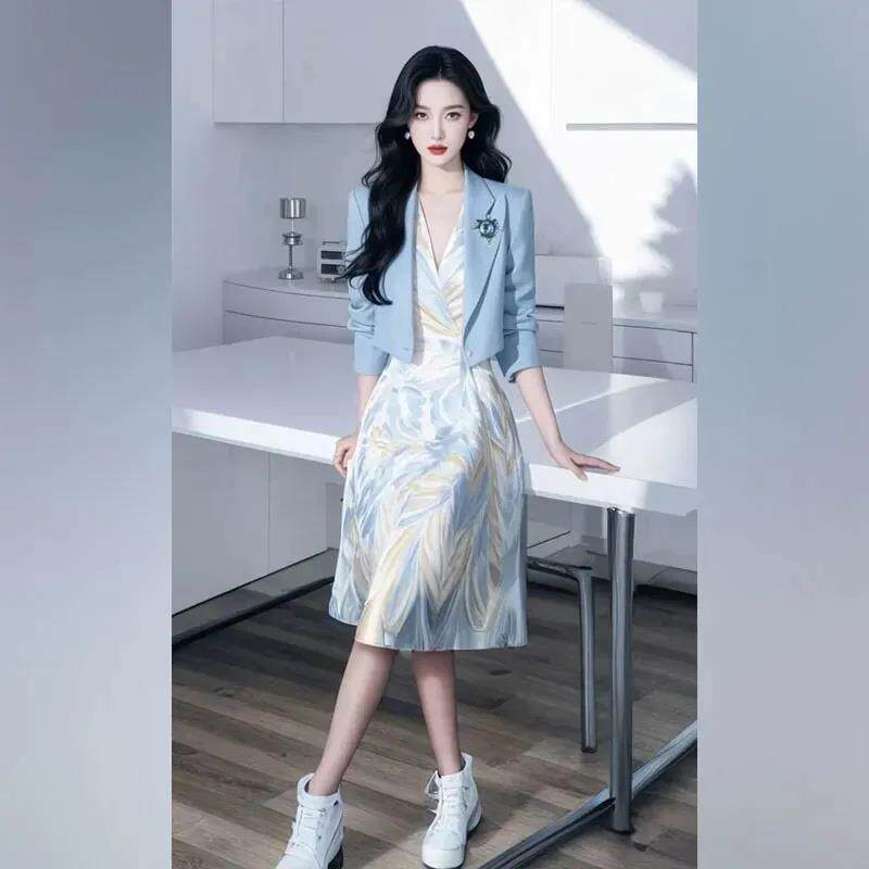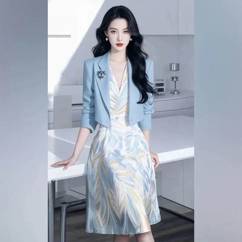 2025春装新款轻奢高级感女人味气质小香风蓝色西装外套连衣裙套装