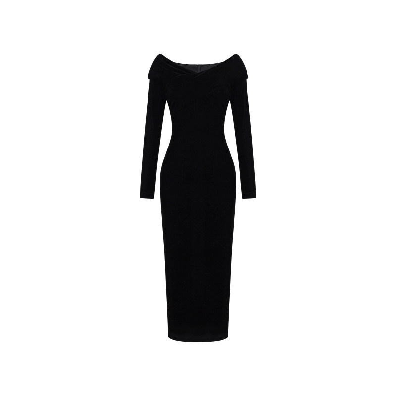 XULU原创秋冬欧洲进口黑色丝绒包臀裙气质露肩显瘦V领长袖连衣裙