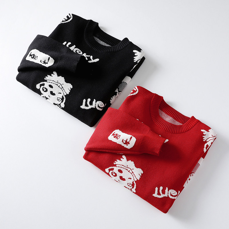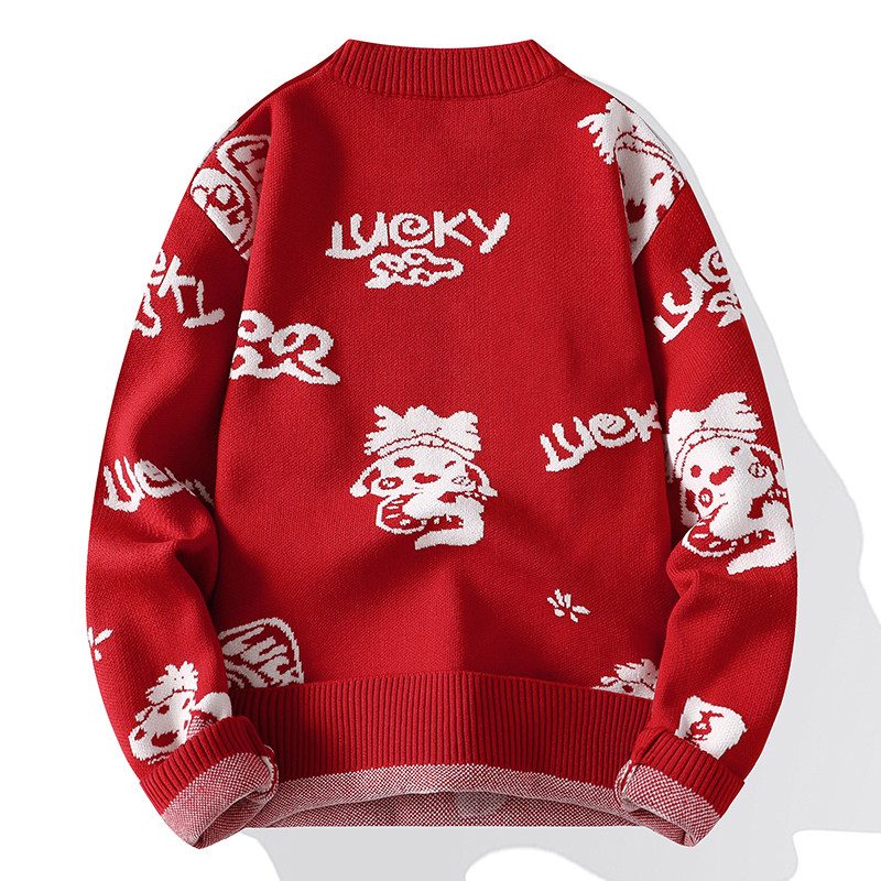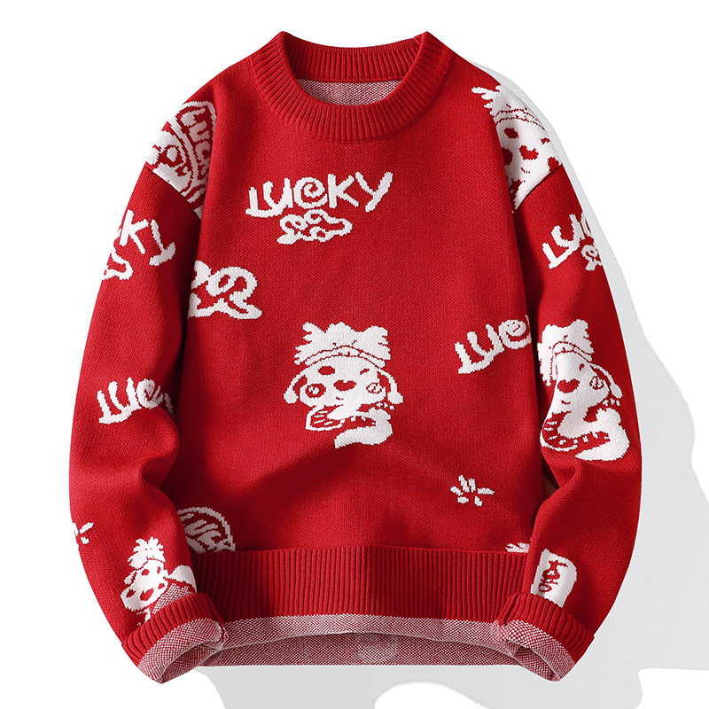 红色喜庆毛衣男士蛇年本命年圆领针织衫外套潮流内搭针织