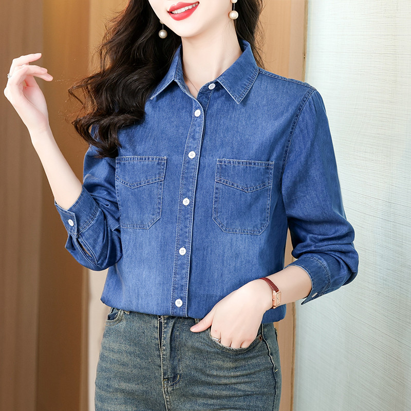 春季新款全棉长袖牛仔衬衫女翻领纽扣开衫休闲上衣中年妈妈装衬衣