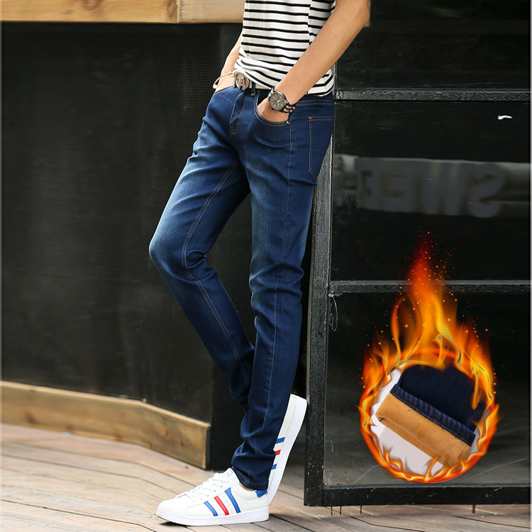 加绒加厚男士牛仔裤修身弹力小脚裤秋冬款青少年加长120cm男裤子