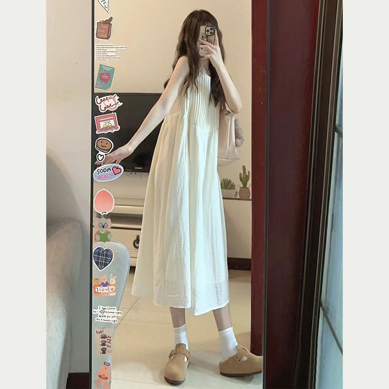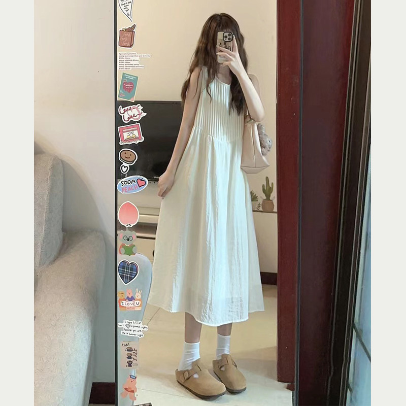 高级感法式气质无袖连衣裙女夏宽松显瘦压褶小个子白色长裙背心裙