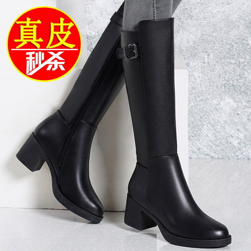 全牛皮真皮女士高筒马靴2026新款爆款秋冬季加绒妈妈长筒长靴高跟