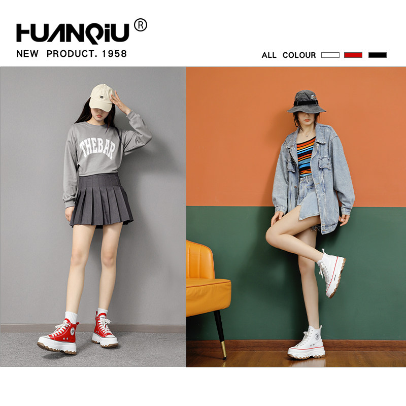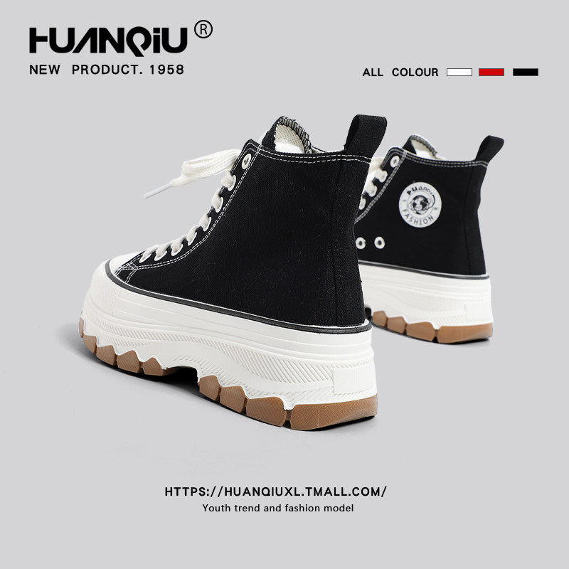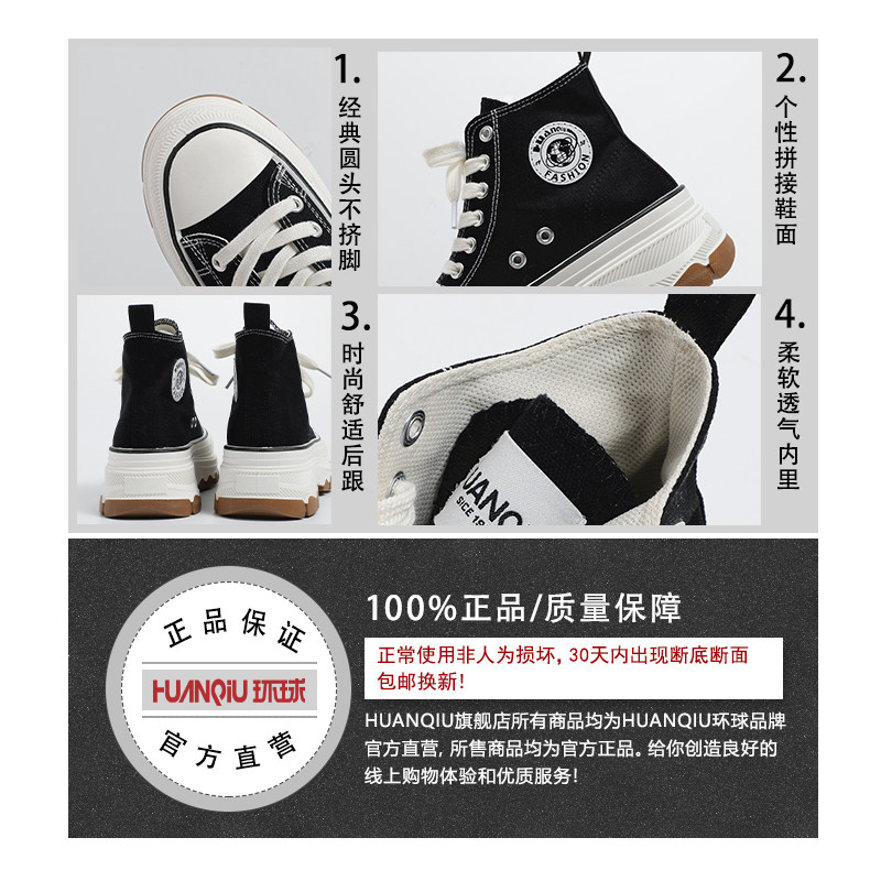 环球高帮帆布鞋女鞋增高厚底黑色平底休闲板鞋软底圆头高跟松糕鞋