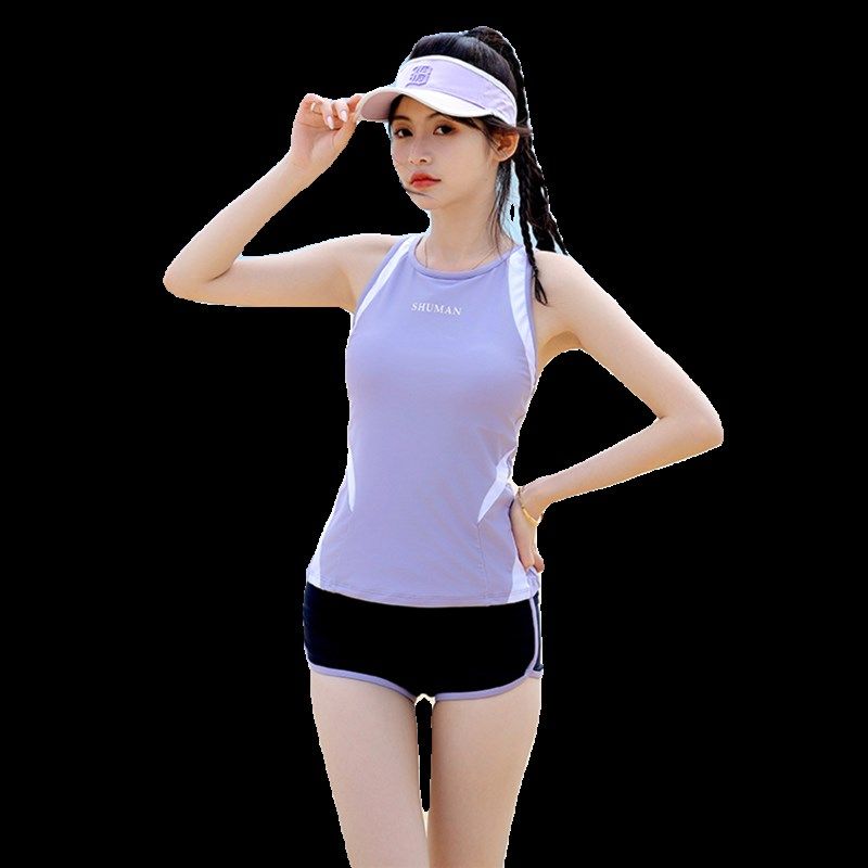 2024新款分体无袖运动平角保守显瘦亮色竞速游泳休闲度假泳衣女