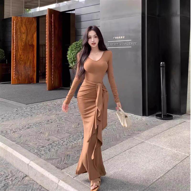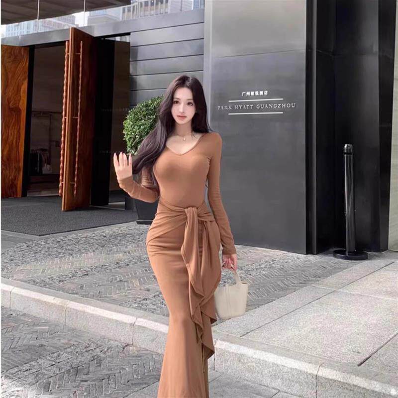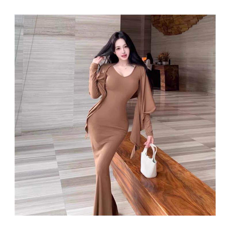 纯欲性感修身长袖连衣裙女秋冬名媛风收腰鱼尾包臀裙长裙披肩套装