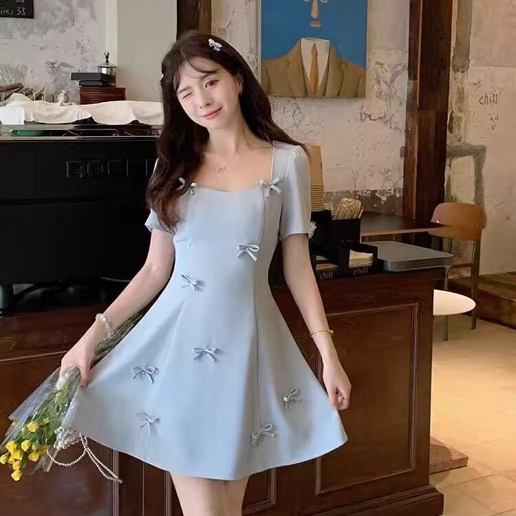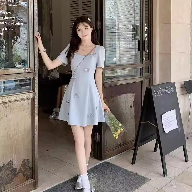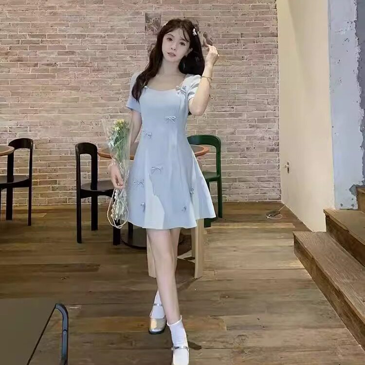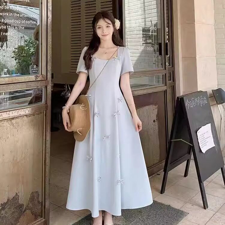 大码短袖连衣裙女夏季收腰气质小个子长裙胖MM法式蝴蝶结温柔裙子