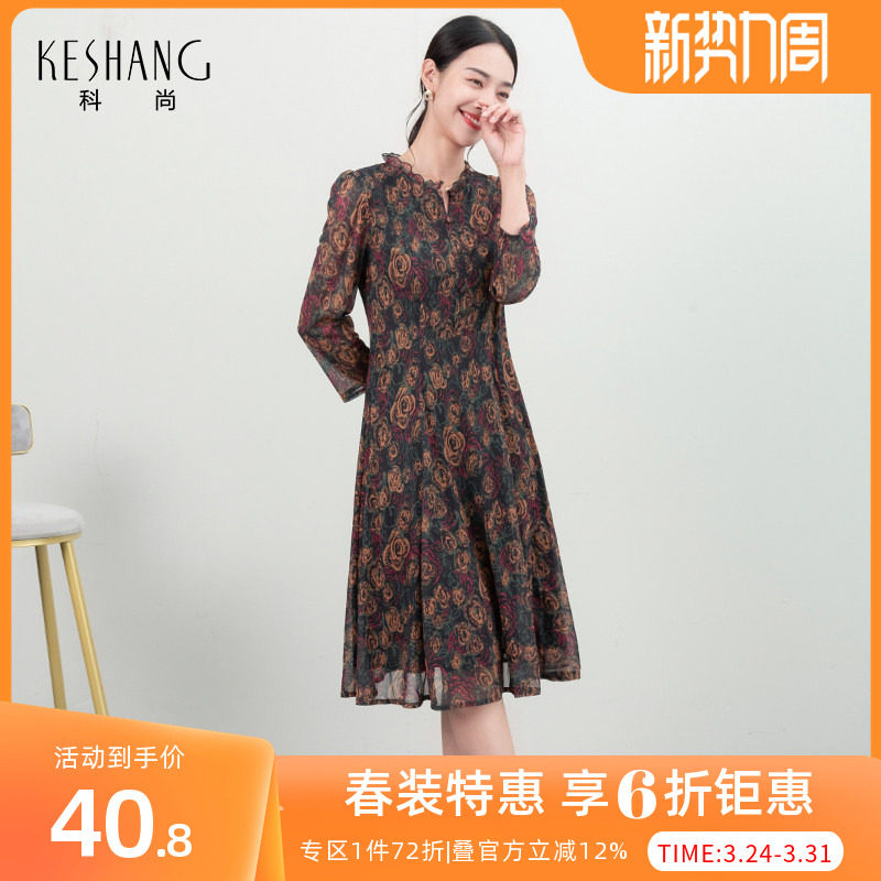 科尚印花连衣裙女2026春季新款复古气质长裙收腰显瘦中袖A字裙子
