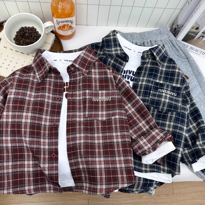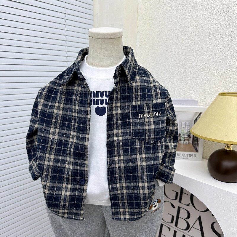 男童春装长袖衬衫2025新款儿童洋气时髦格子薄款衬衣男孩春秋上衣
