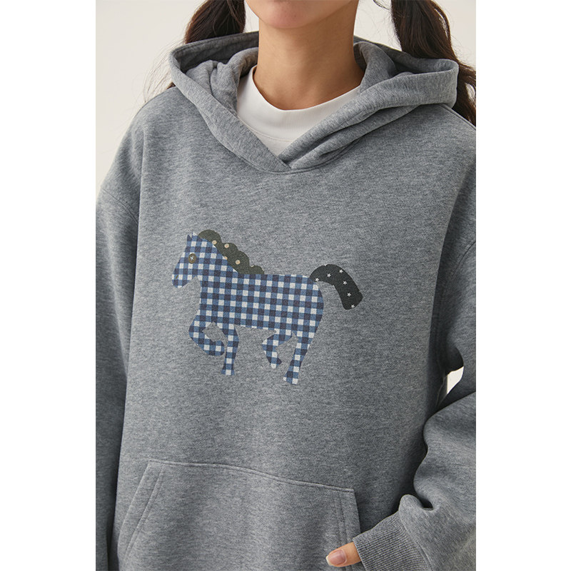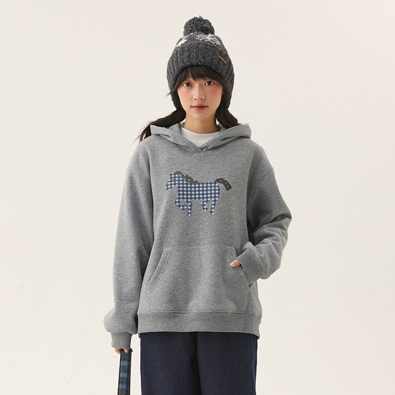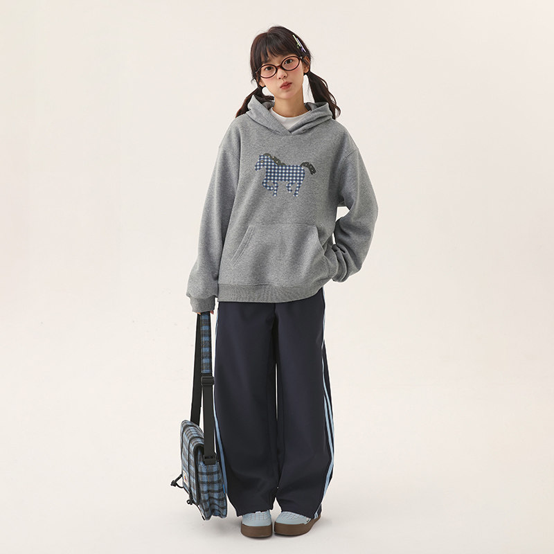 诺诺公主S1N 初中生灰色连帽卫衣女春秋加绒青少年韩系马年好运