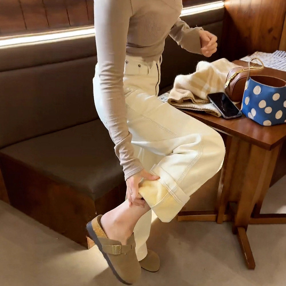 直筒牛仔裤加绒冬季女款25年现款美式米杏色高腰拖地宽松阔腿裤子