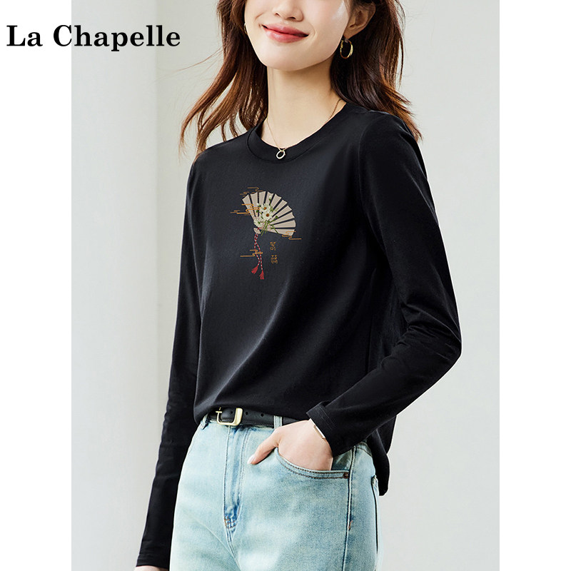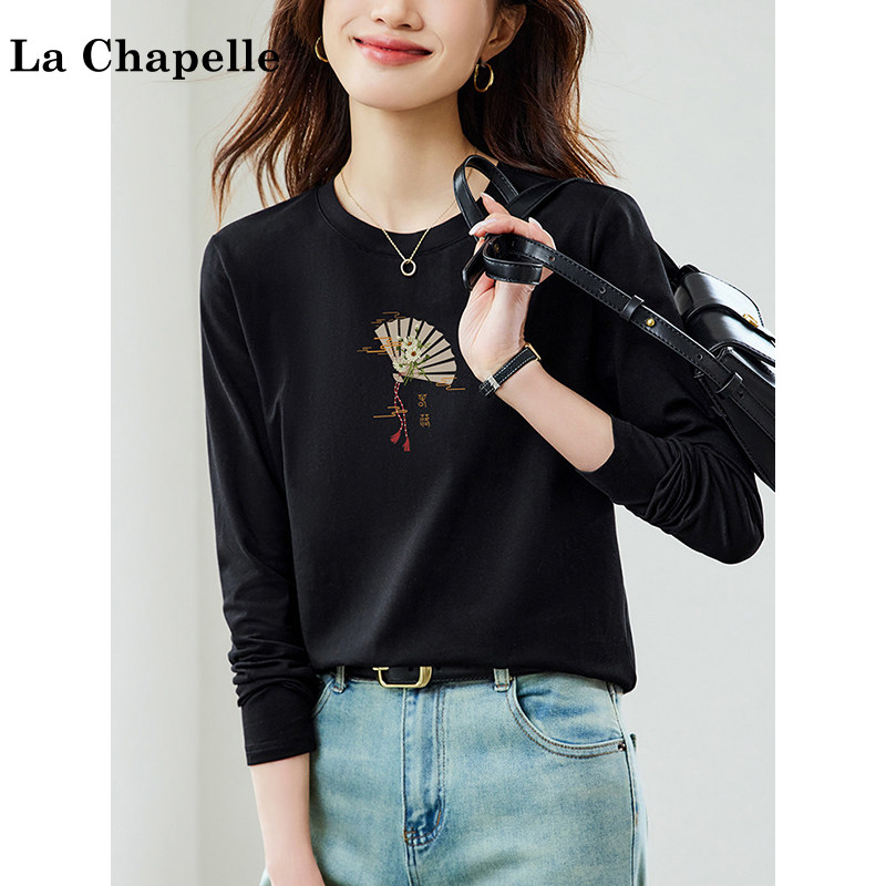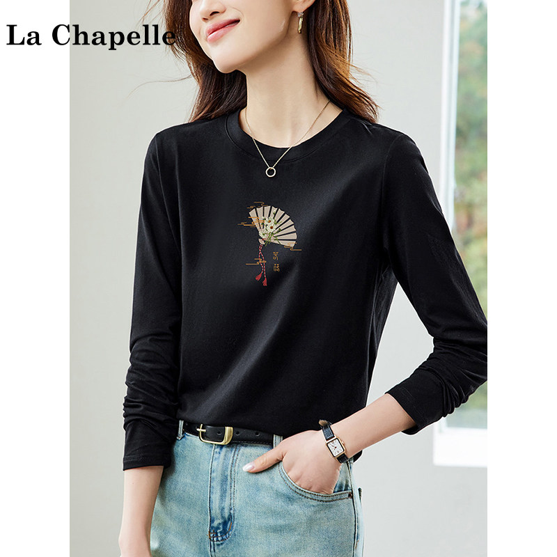 拉夏贝尔纯棉黑色长袖t恤女装2026新款春季宽松百搭正肩打底上衣