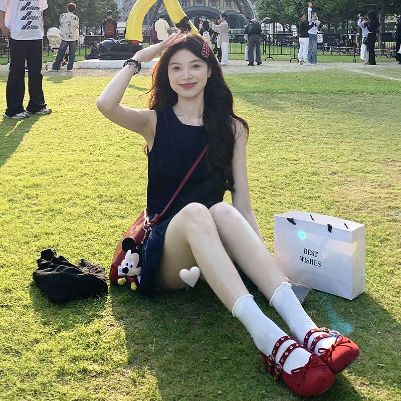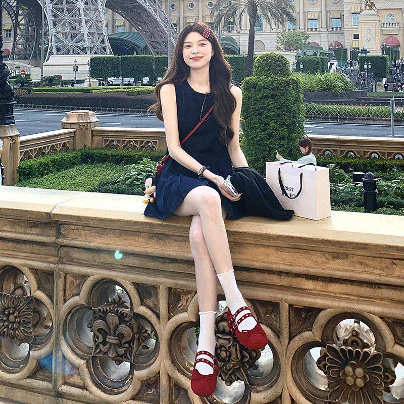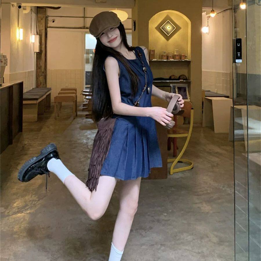 牛仔百褶裙女2026夏季薄款无袖高腰修身显瘦学院风小个子连衣裙子