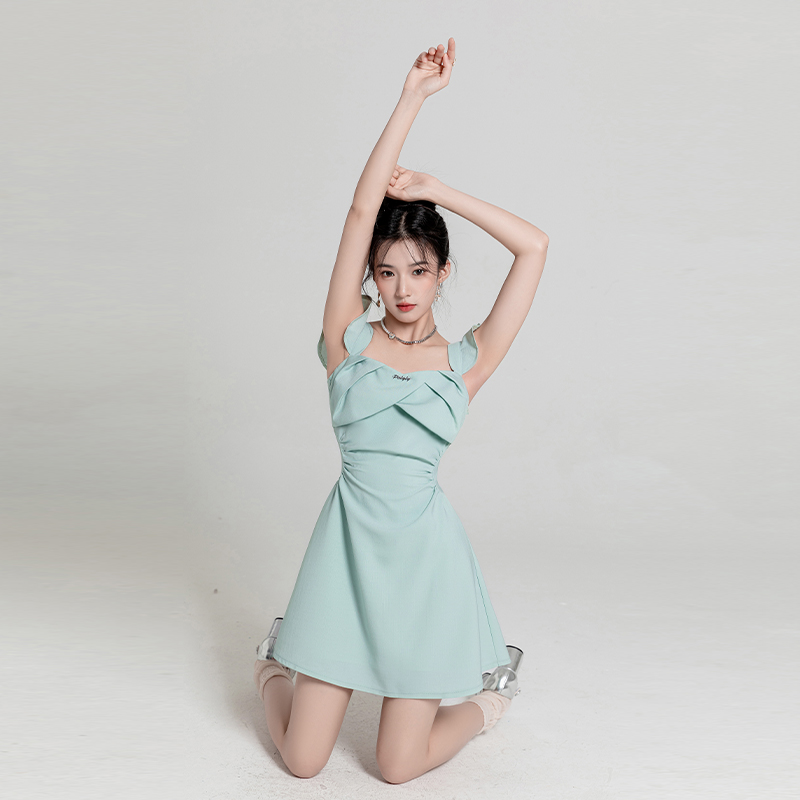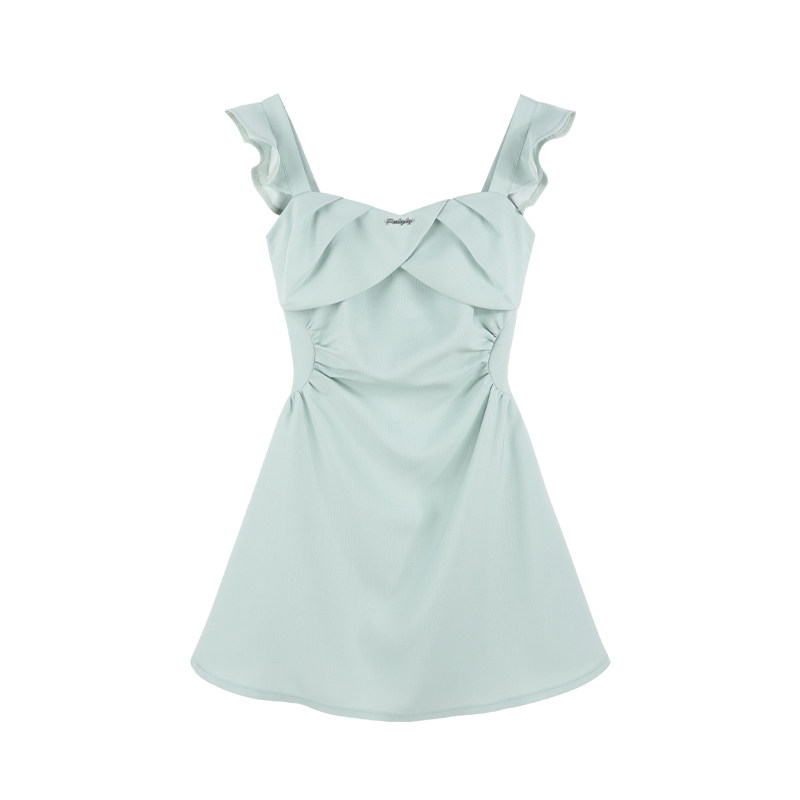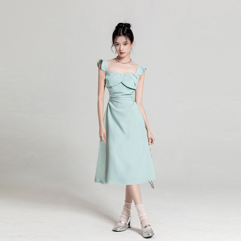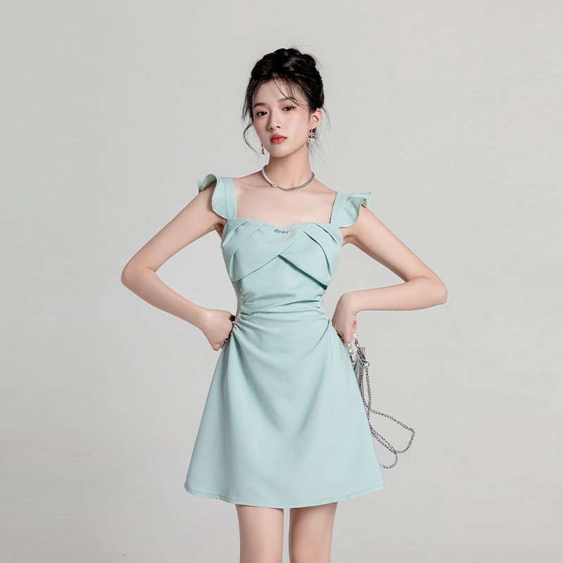 绿色小香风无袖连衣裙女夏季小个子收腰法式富家千金a字吊带短裙