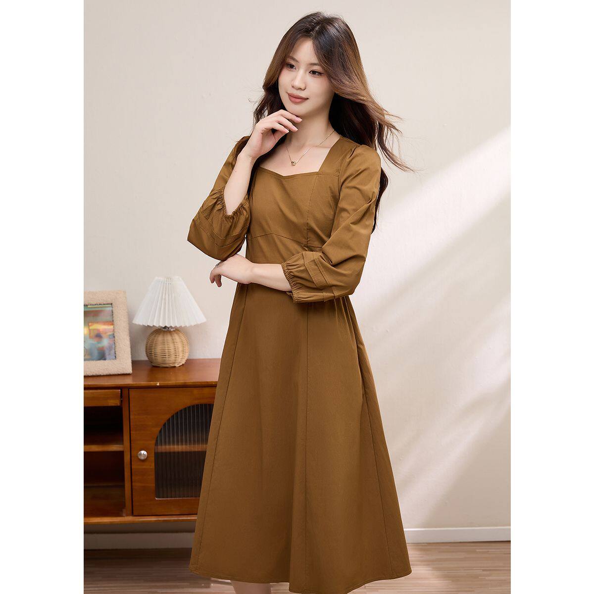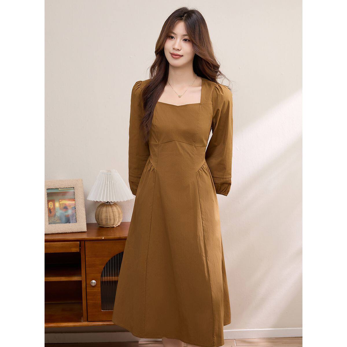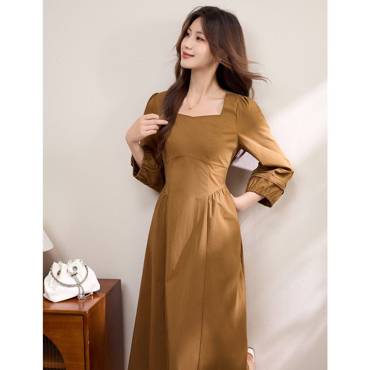 法式赫本风连衣裙高级感早春复古方领收腰a字长袖长裙温柔女大码