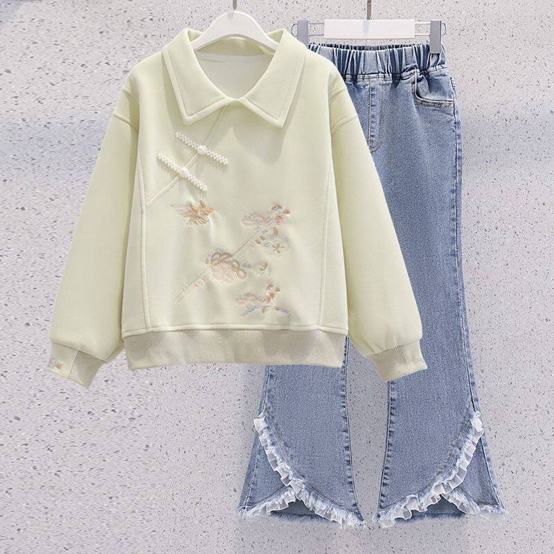 女童网红春秋装套装洋气复古2025新款中大童卫衣休闲时髦牛仔裤潮