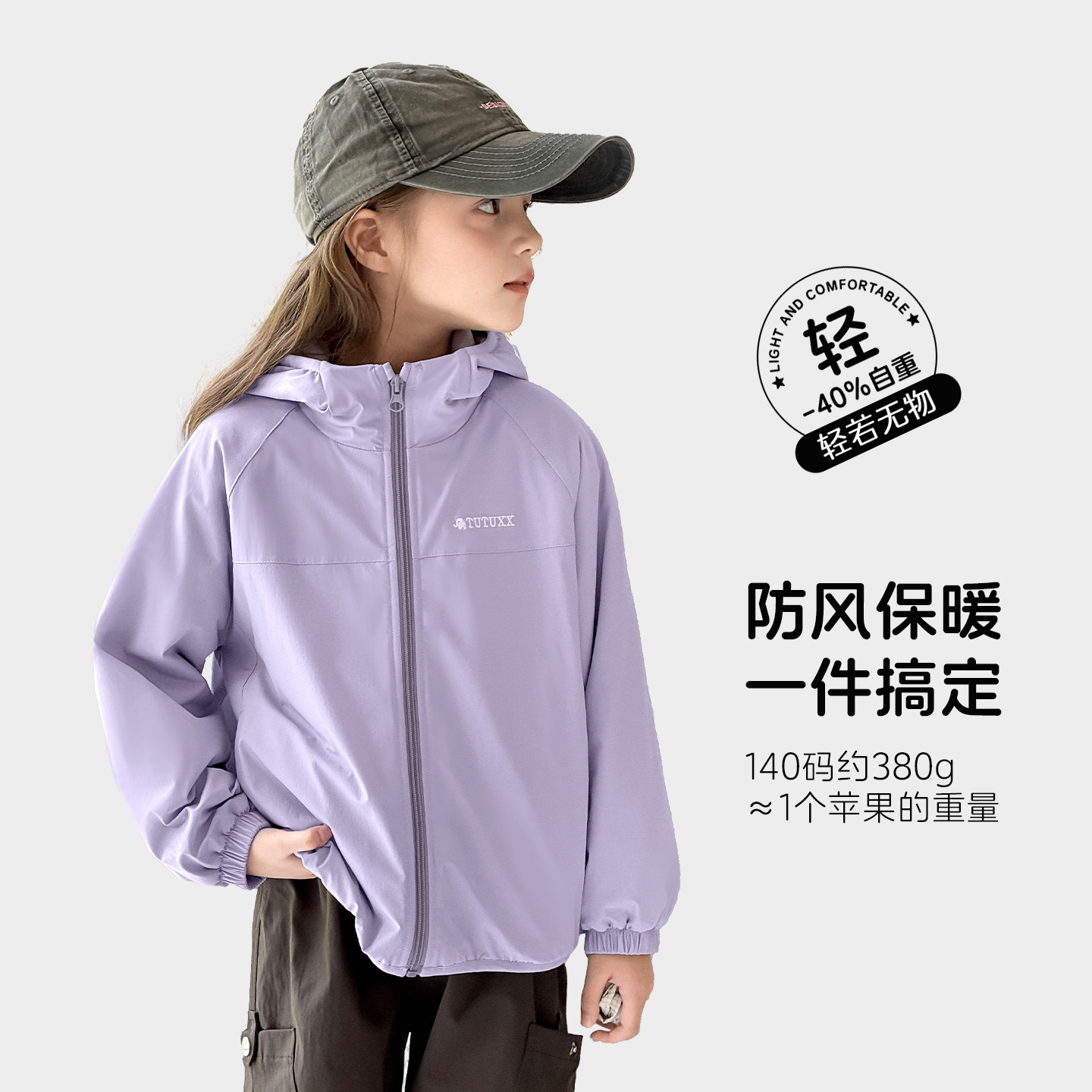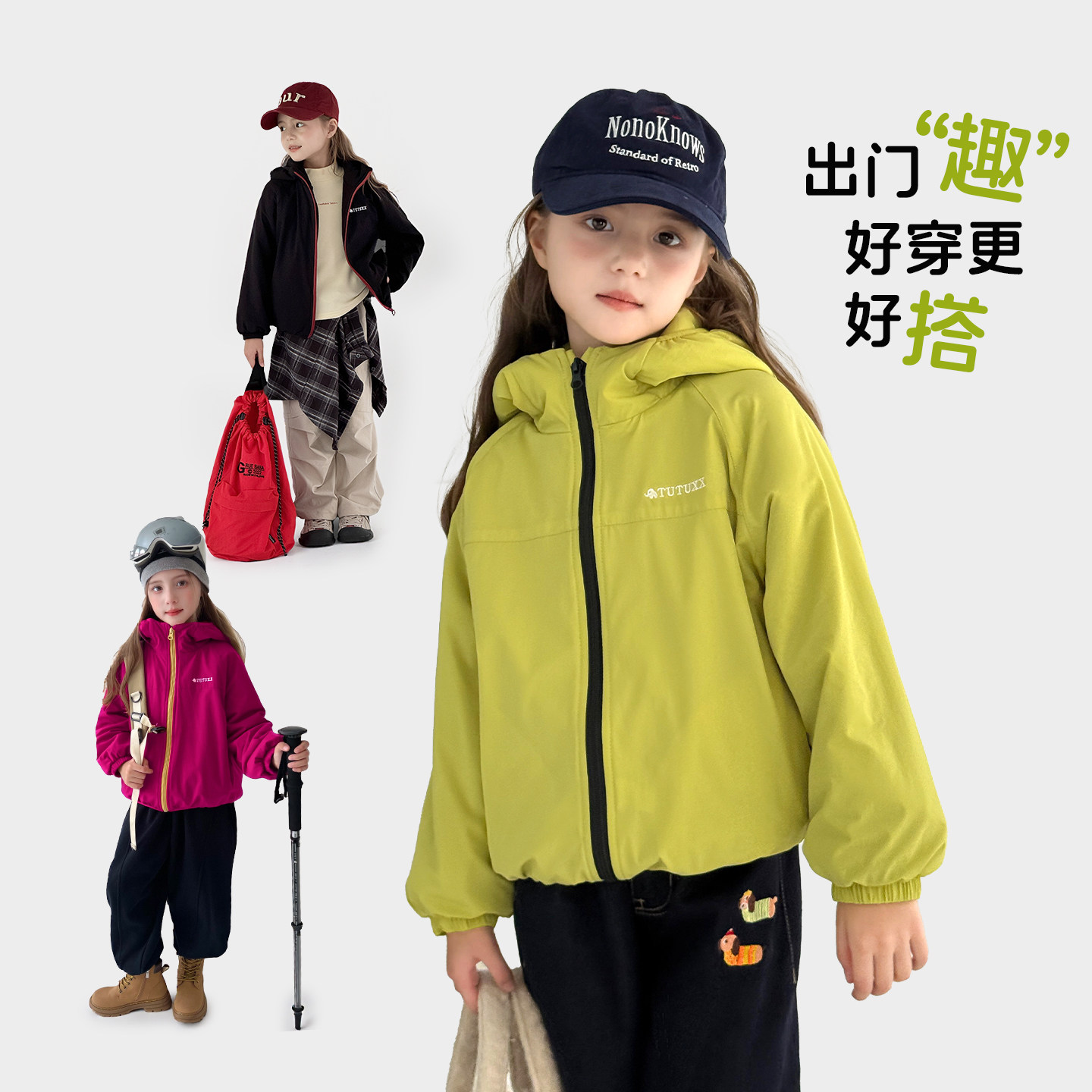 图图小象童装女童春装外套儿童2026春秋新款加绒连帽冲锋衣上衣